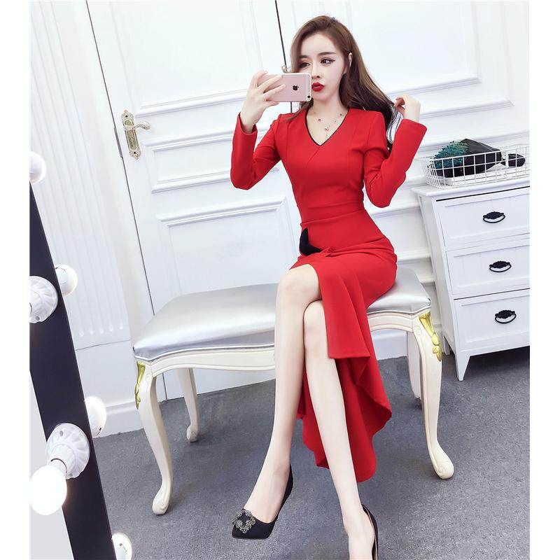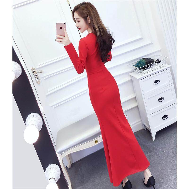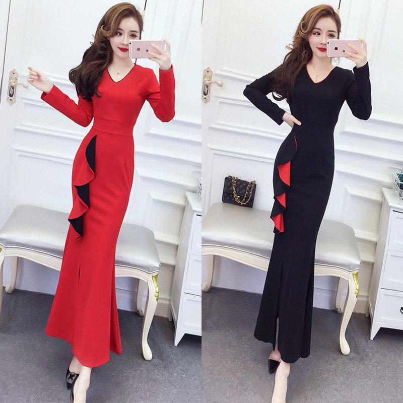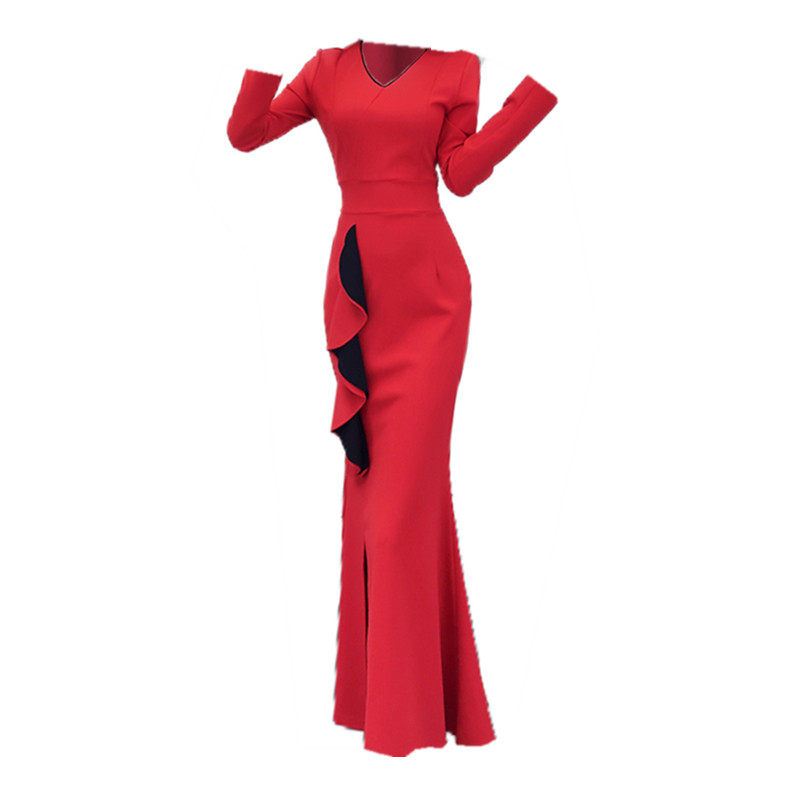 💃 "闪耀晚宴!女神必备的红色V领荷叶边鱼尾裙💖"