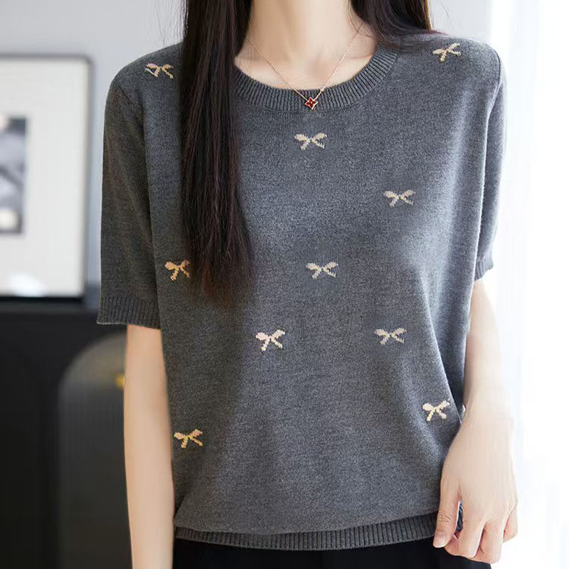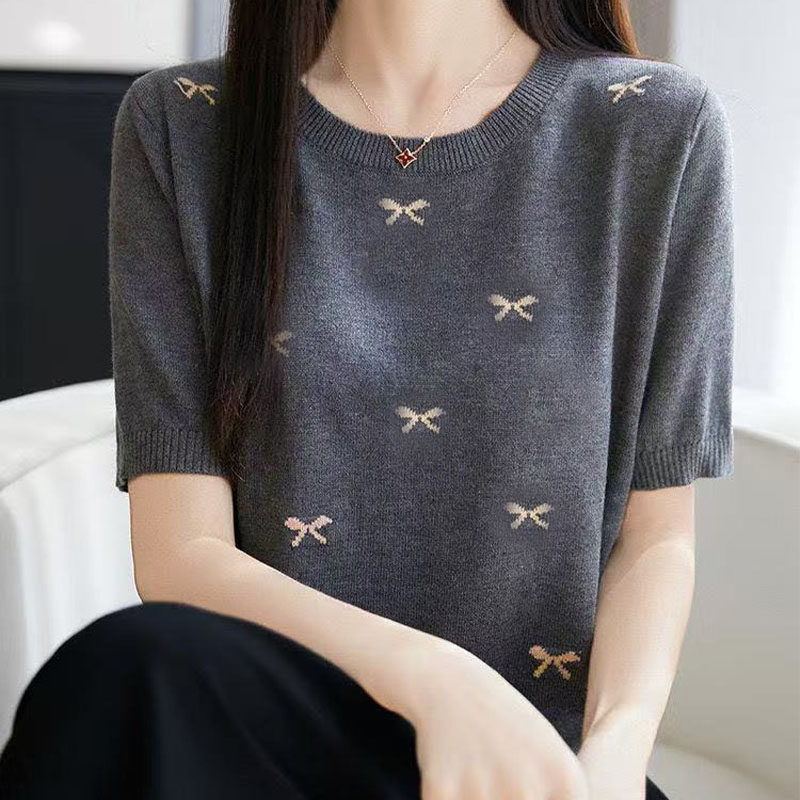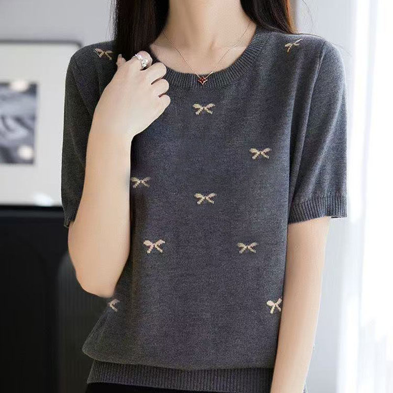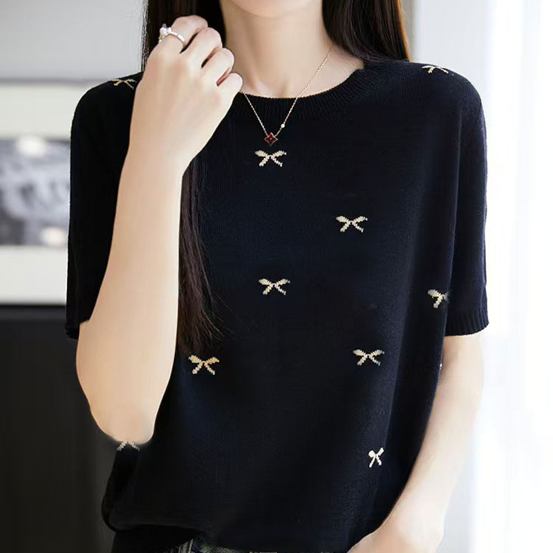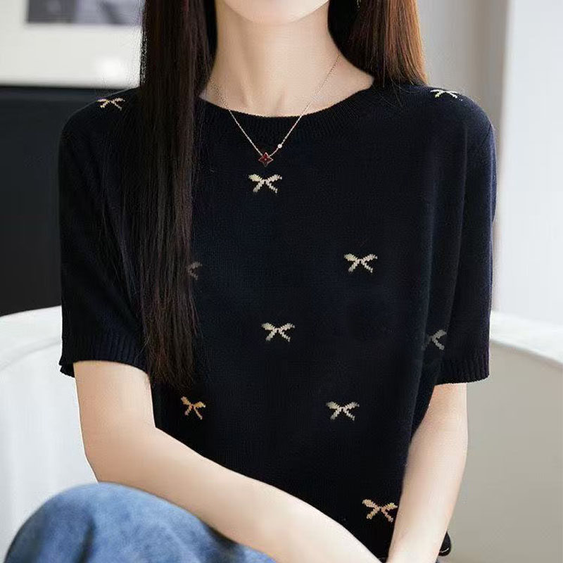 📚 2025夏女圆领蝴蝶结电脑提花薄款冰丝短袖针织衫遮肉显瘦百搭T恤