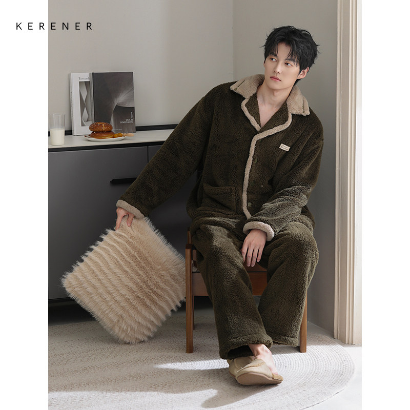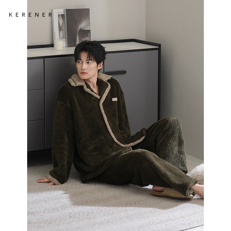 📚 可人儿睡衣男冬季珊瑚绒加厚加绒保暖可外穿翻领男士舒棉绒家居服