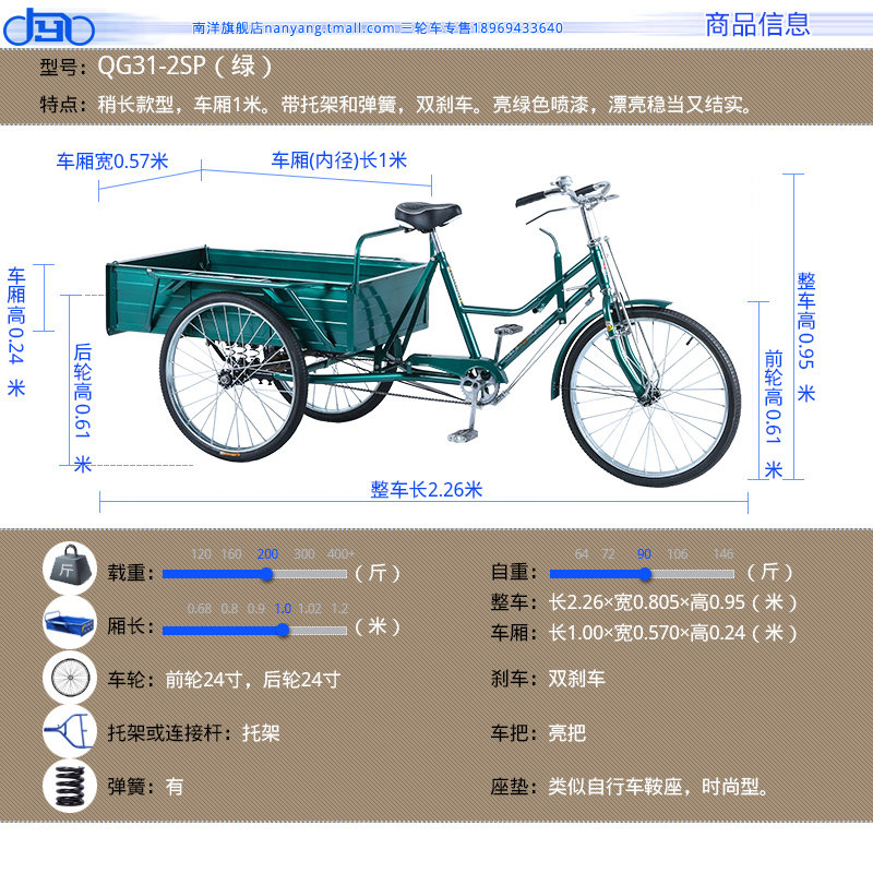 87¥ CZ001 z3925iQPgD6¥ https://m.tb.cn/h.irdBzVS 南洋1米长车厢大三轮脚踏车自行车带货运拉货大人人力三轮车 --------------------- 【原售价】838元 【现售价】838元。