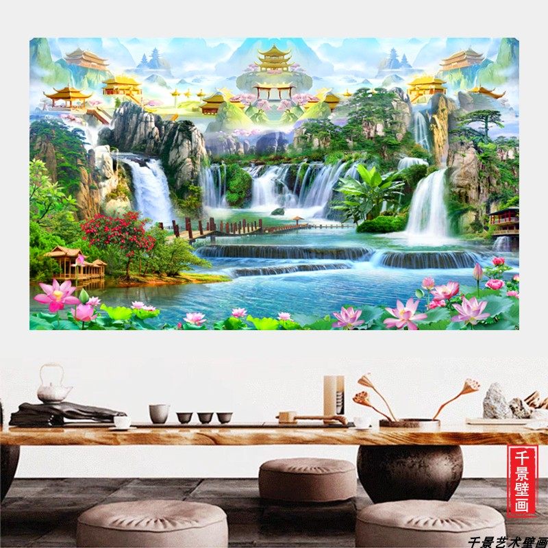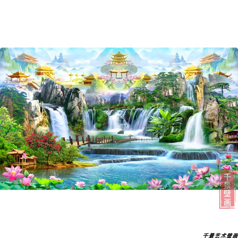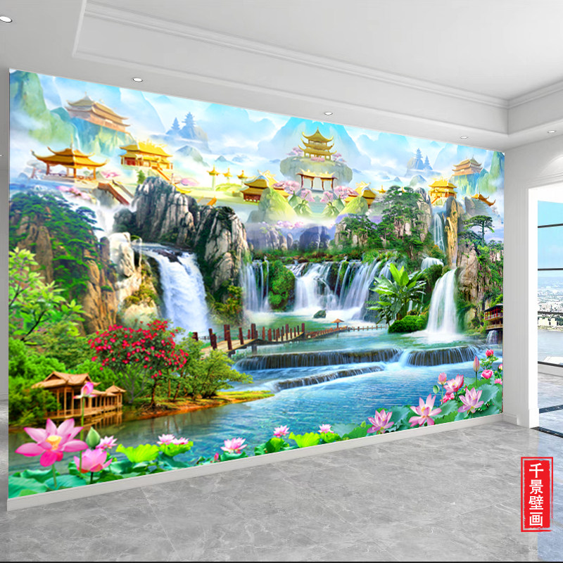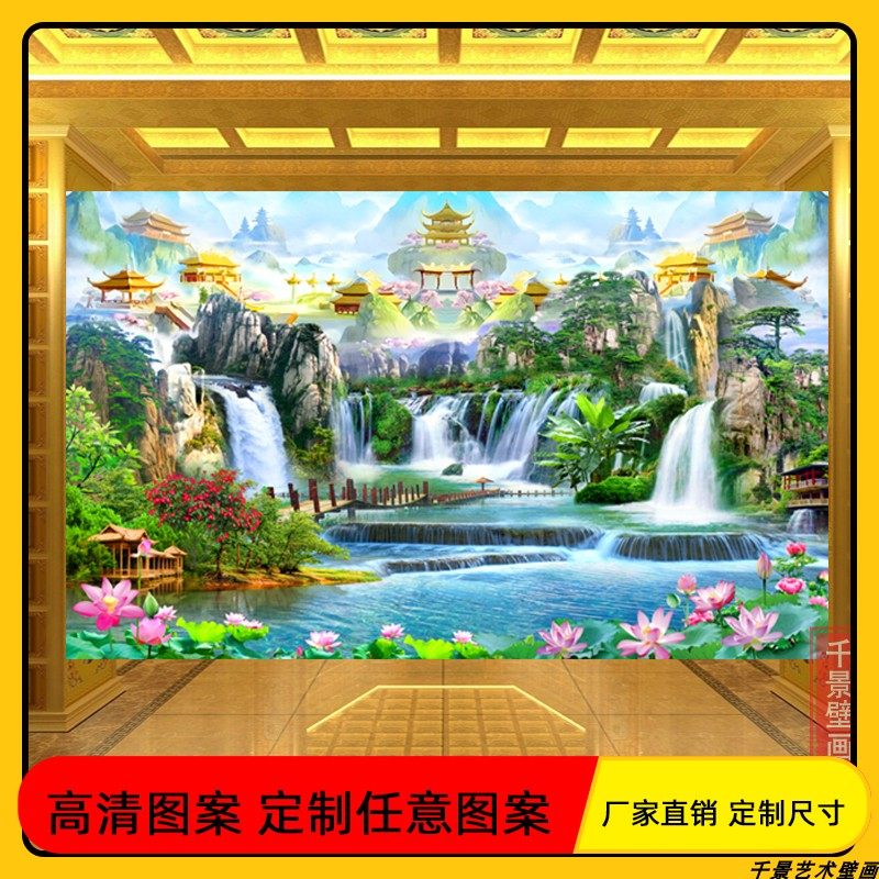 📚 仙境南天门壁画山水画无活物背景墙中式壁画定制佛堂墙面墙纸堂口