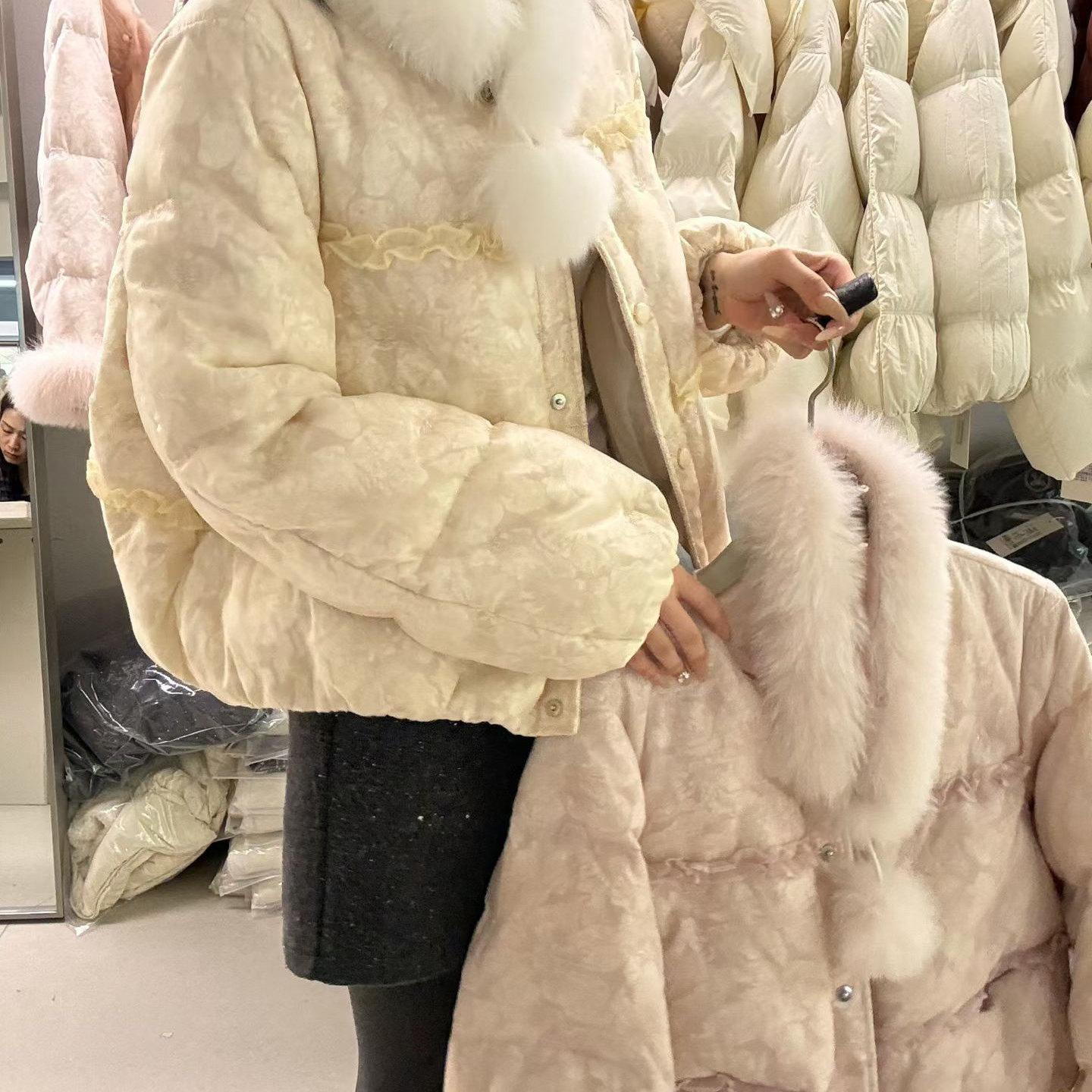 📚 TSPL新中式毛领羽绒服女短款2025冬米白色白鸭绒保暖外套配狐狸毛