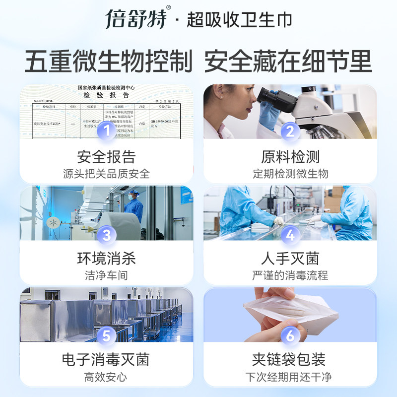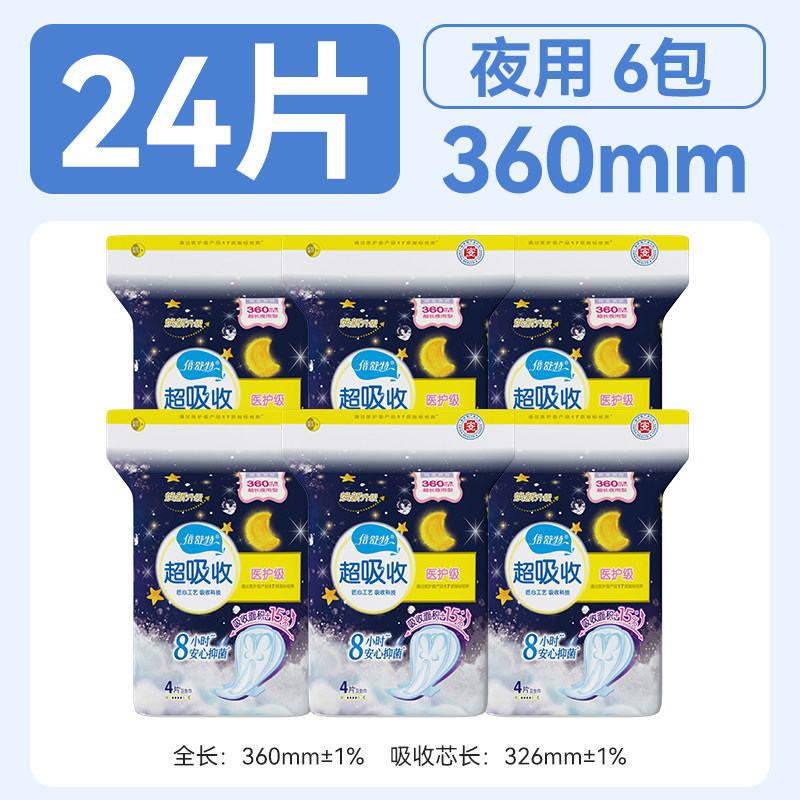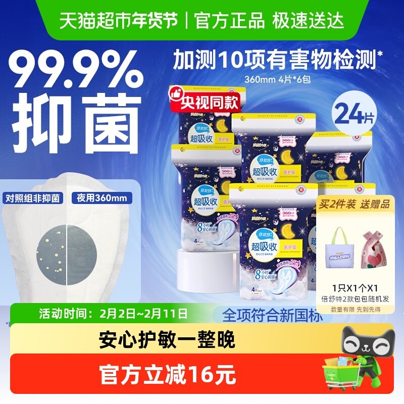 📚 【全项符合新国标】倍舒特卫生巾夜用防漏姨妈巾女360mm4片×6包