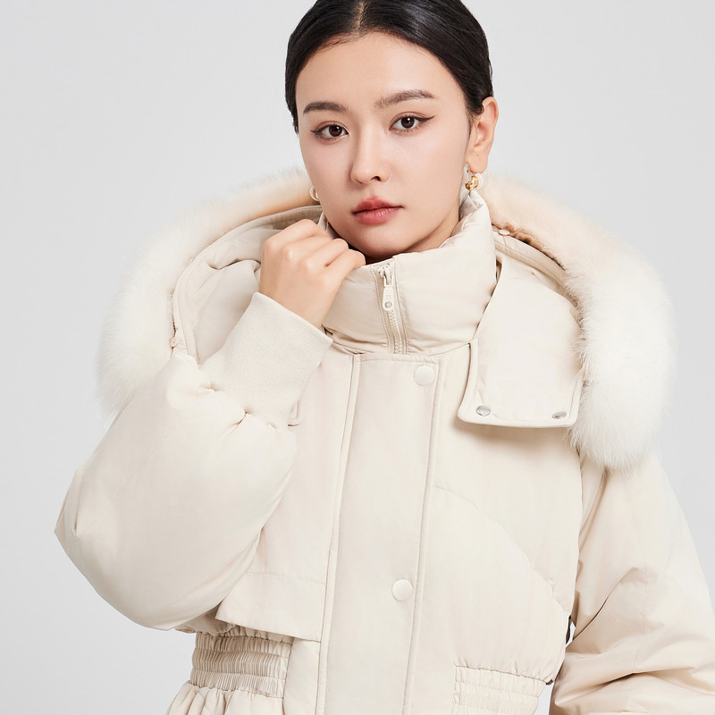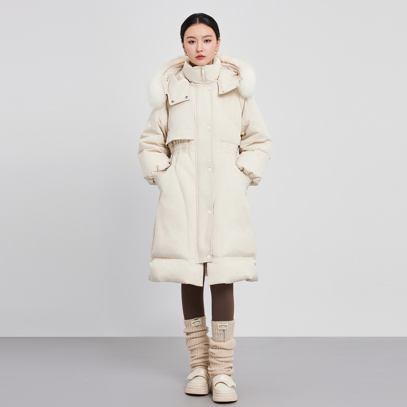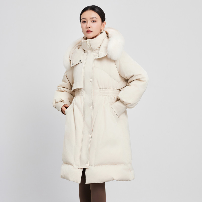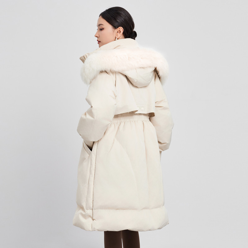 📚 鲁思蒂长款带毛领羽绒服2024年新款女冬季时尚加厚白鸭绒连帽外套
