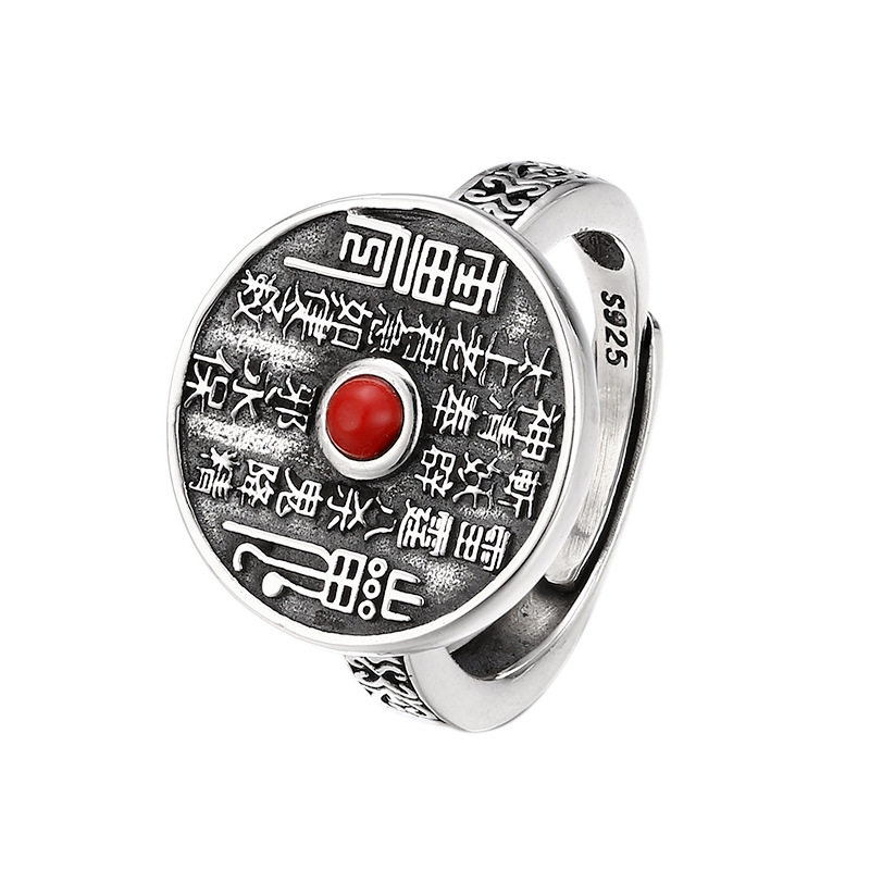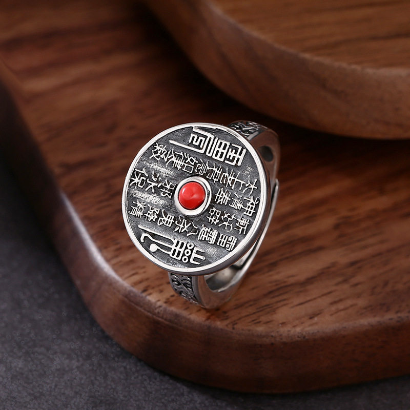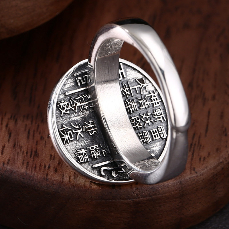 📚 S925纯银复古民族风山鬼花钱吉祥好运个性百搭圆牌开口戒指环