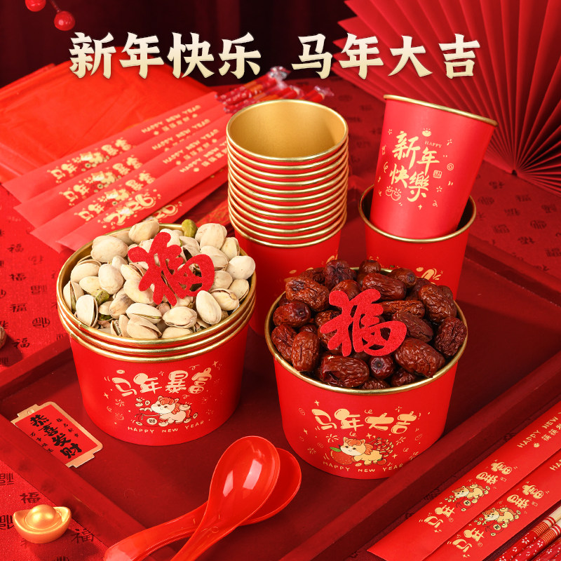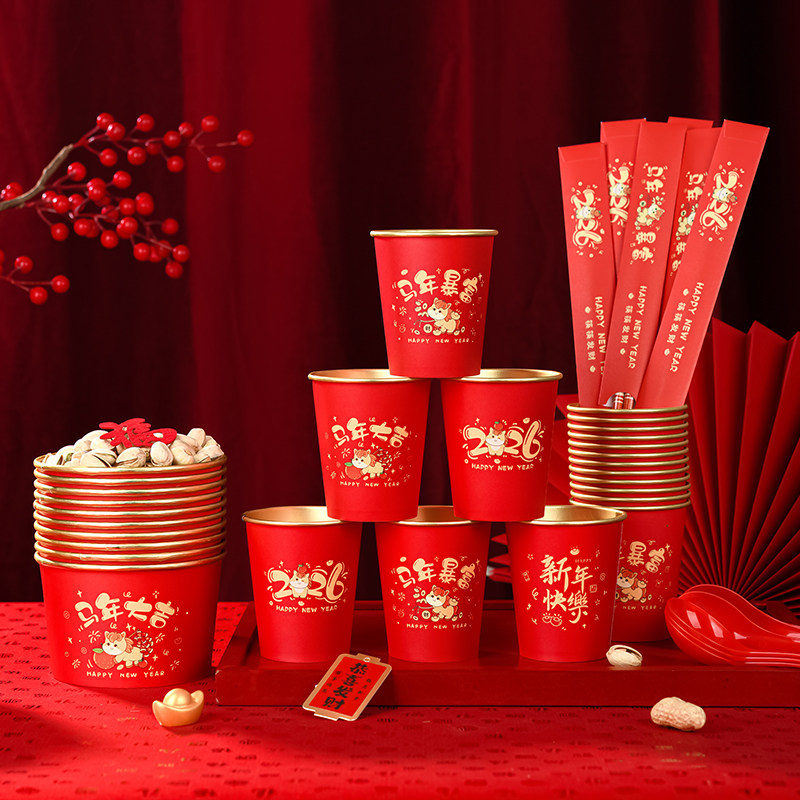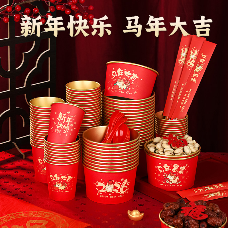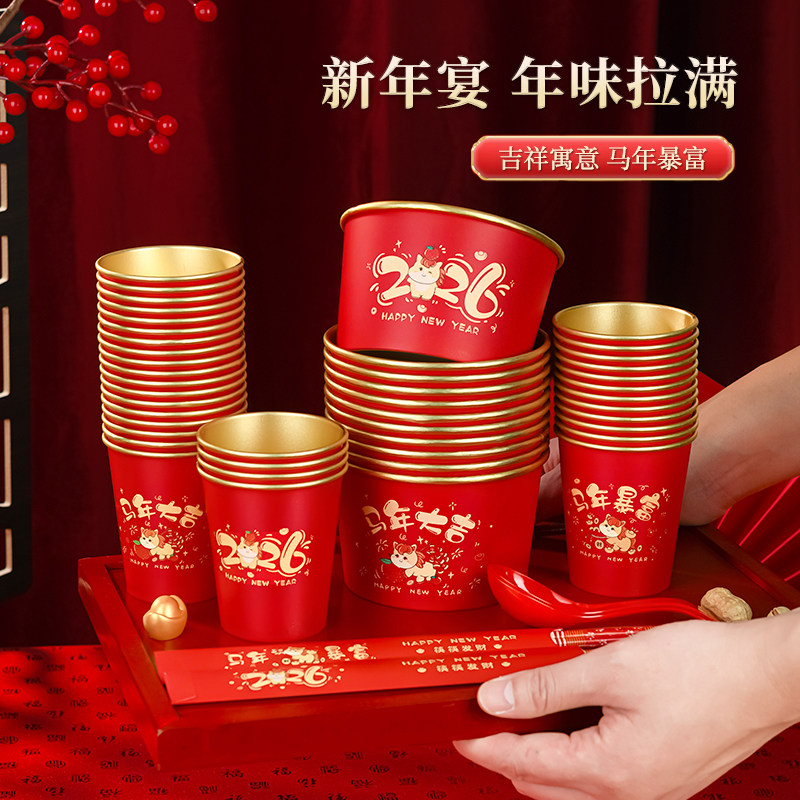 📚 2026马年金箔纸碗纸杯一次性家用加厚杯碗筷勺套件春节喜庆贺岁