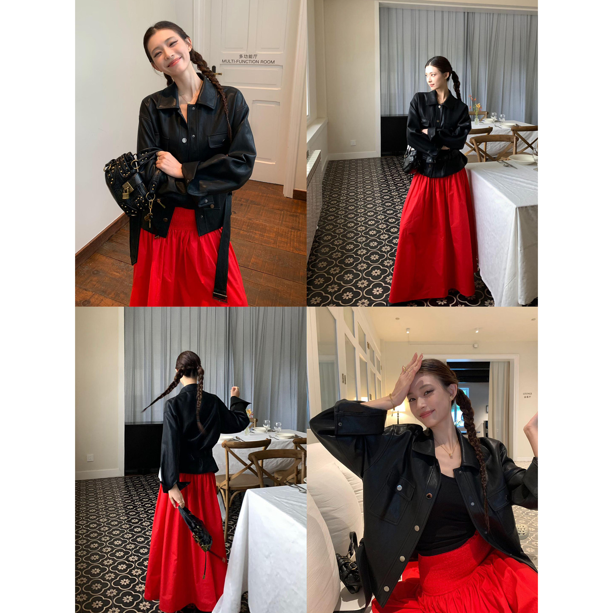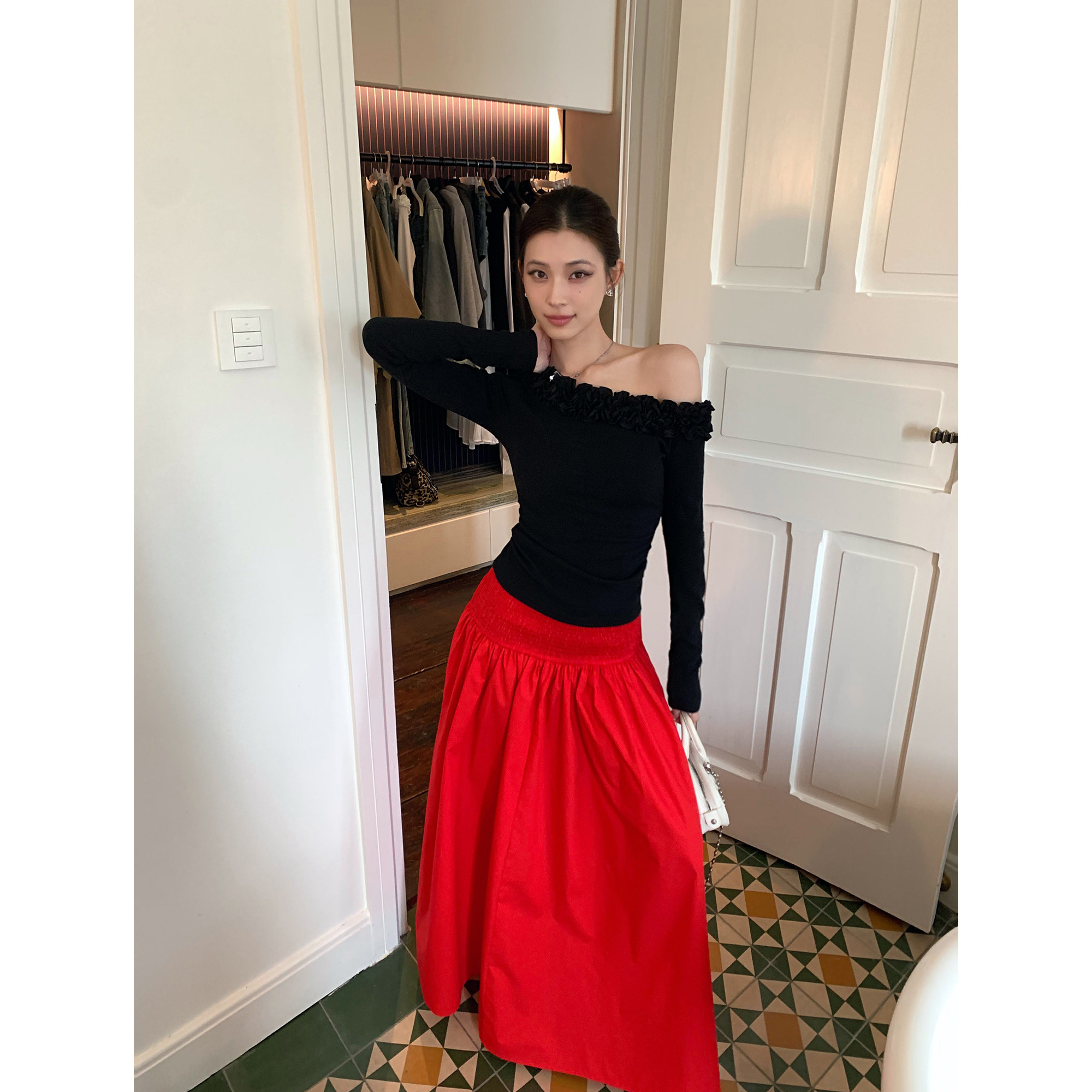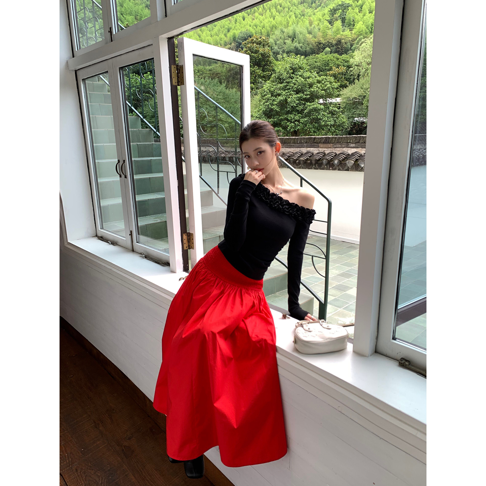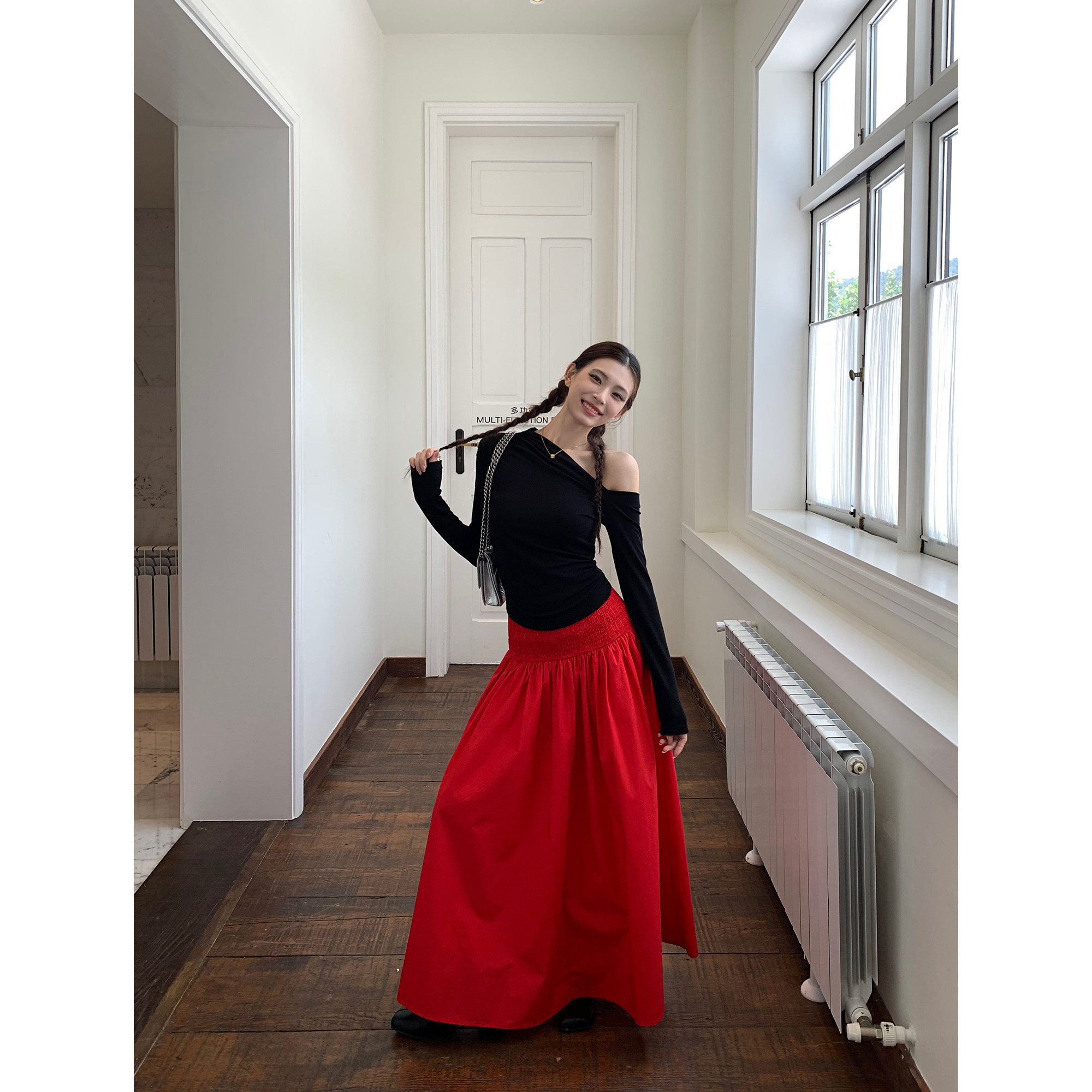 📚 辰米范 情非得已 鲜艳红色松紧腰褶皱半身裙女气质大摆A字中长裙