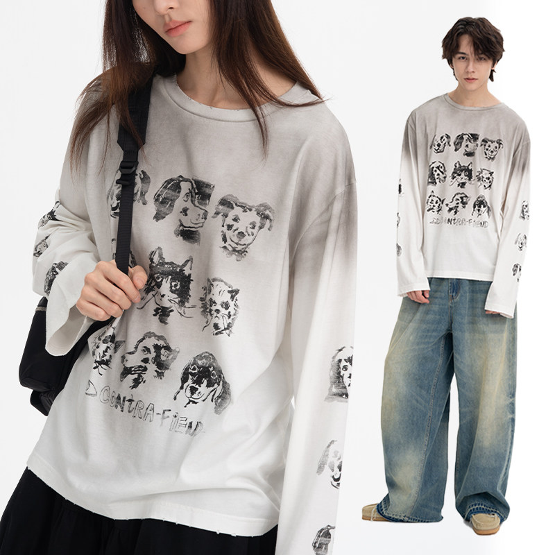 📚 CONTRAFIEND复古做旧马骝猫狗大联盟印花长袖T恤 宽松圆领上衣