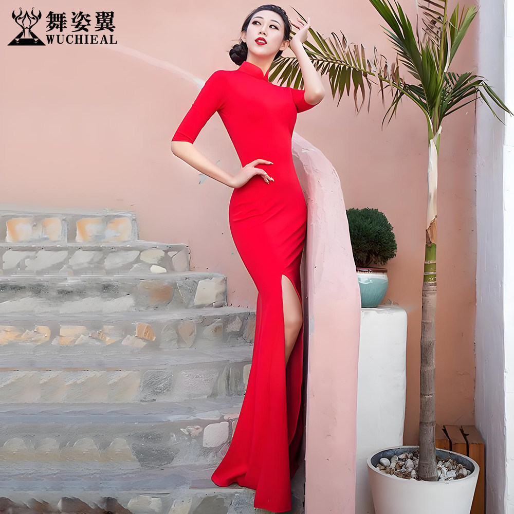 📚 舞姿翼修身形体礼仪服走秀婚宴中式古典罗马棉中袖改良旗袍连衣裙