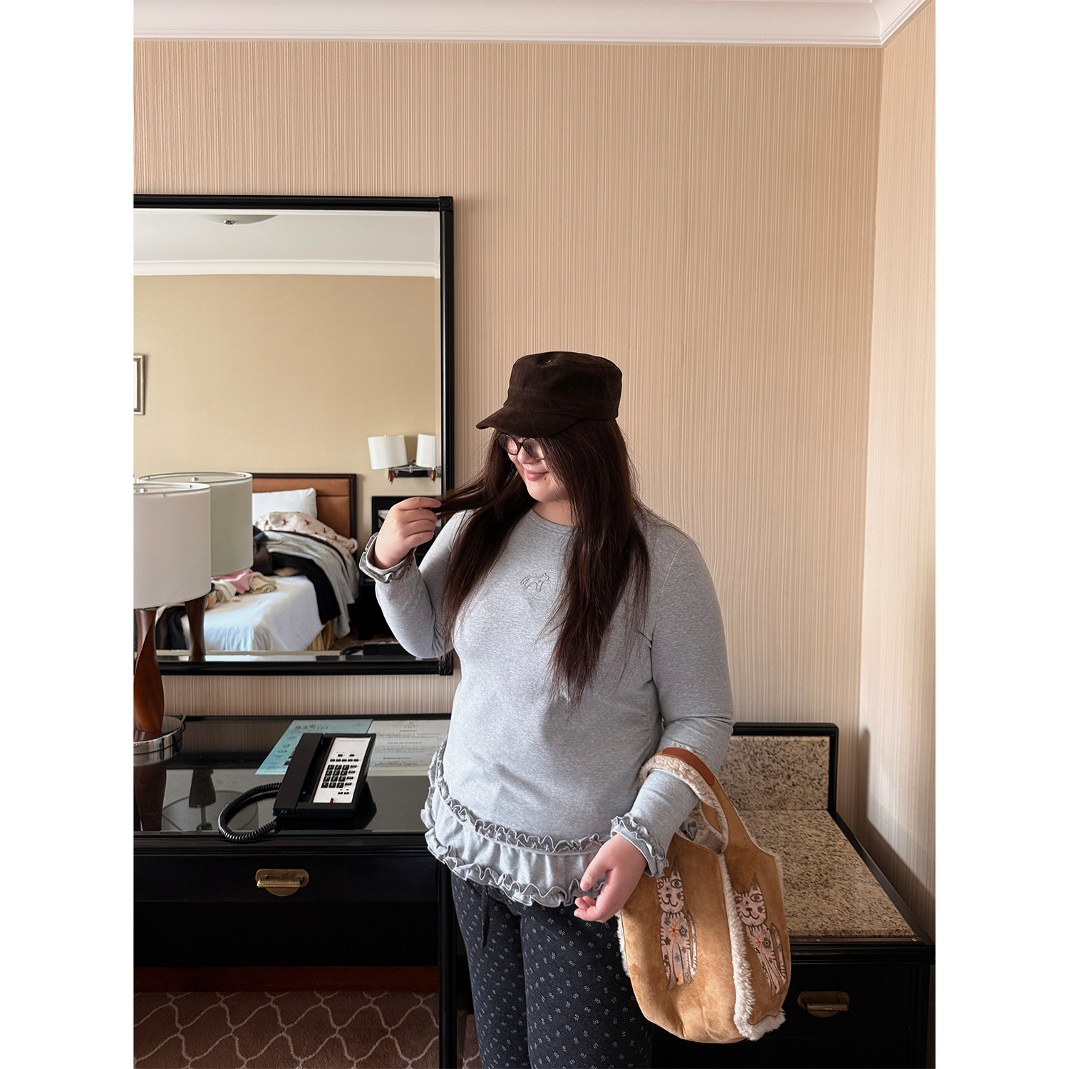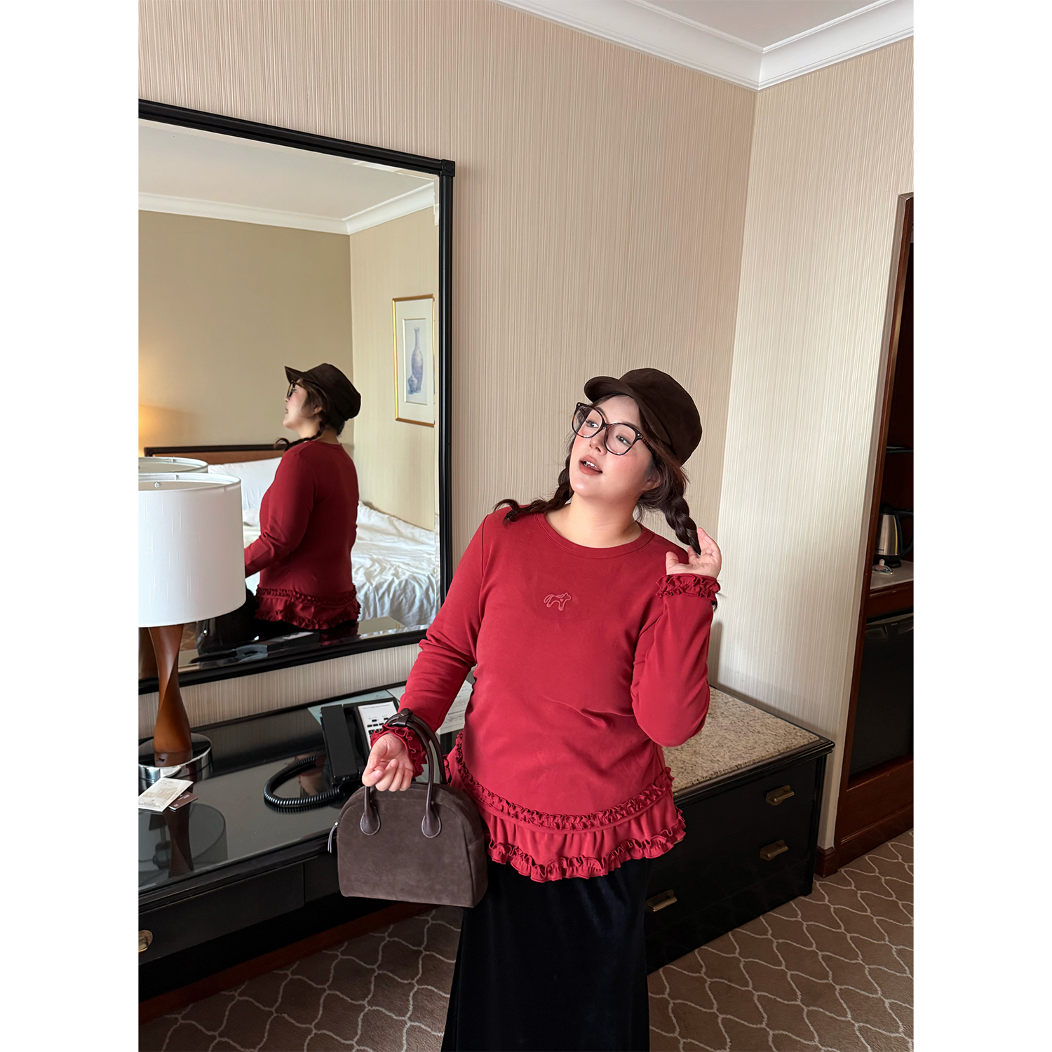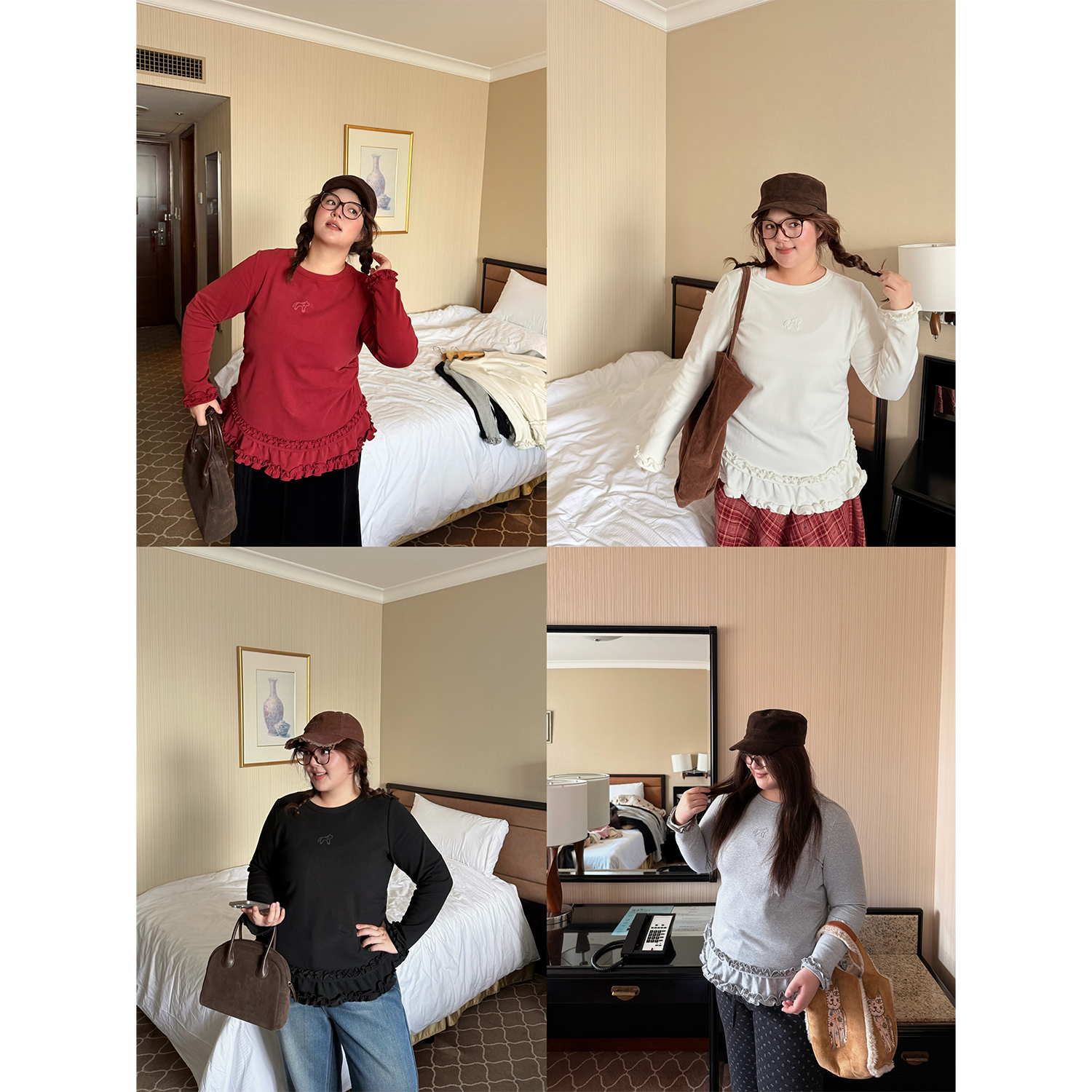 📚 老章和小胖PONGKIKI小萌马花边双面暖绒T恤女大码百搭修身上衣冬