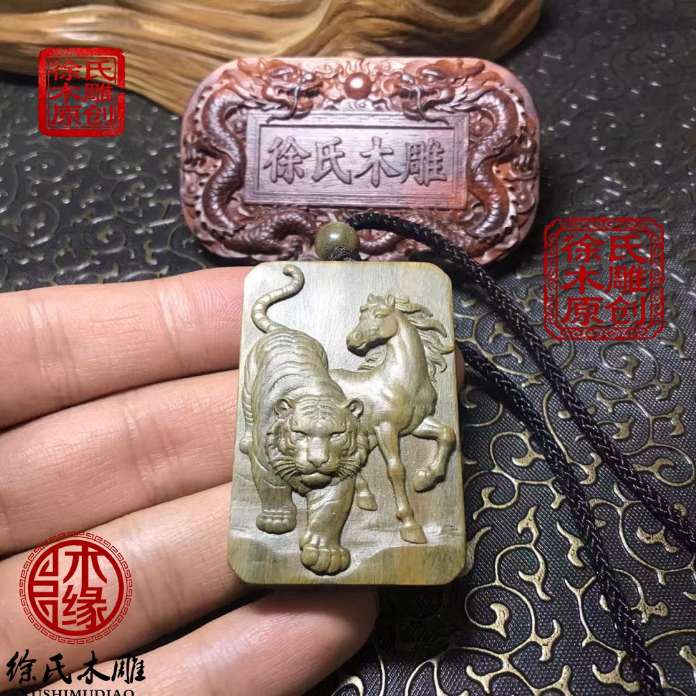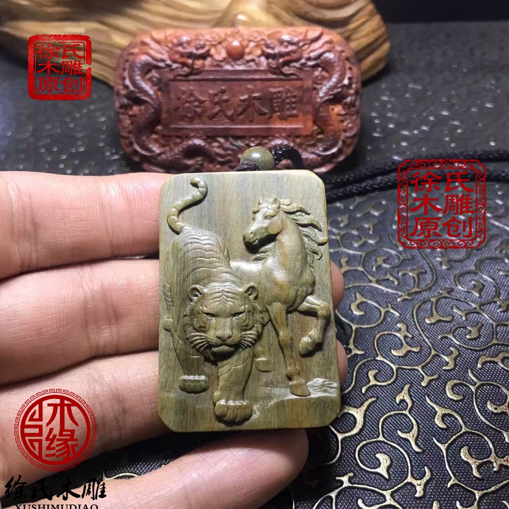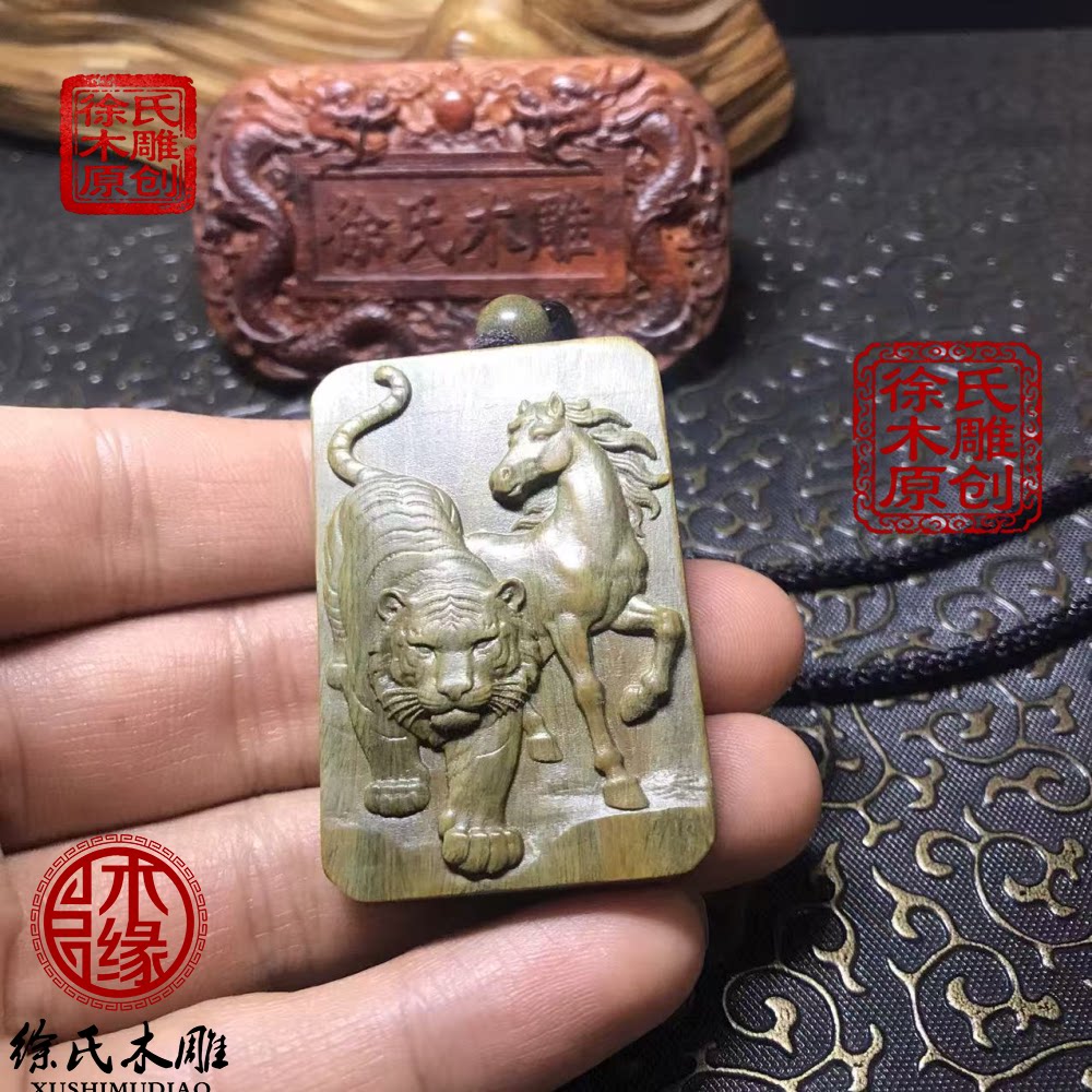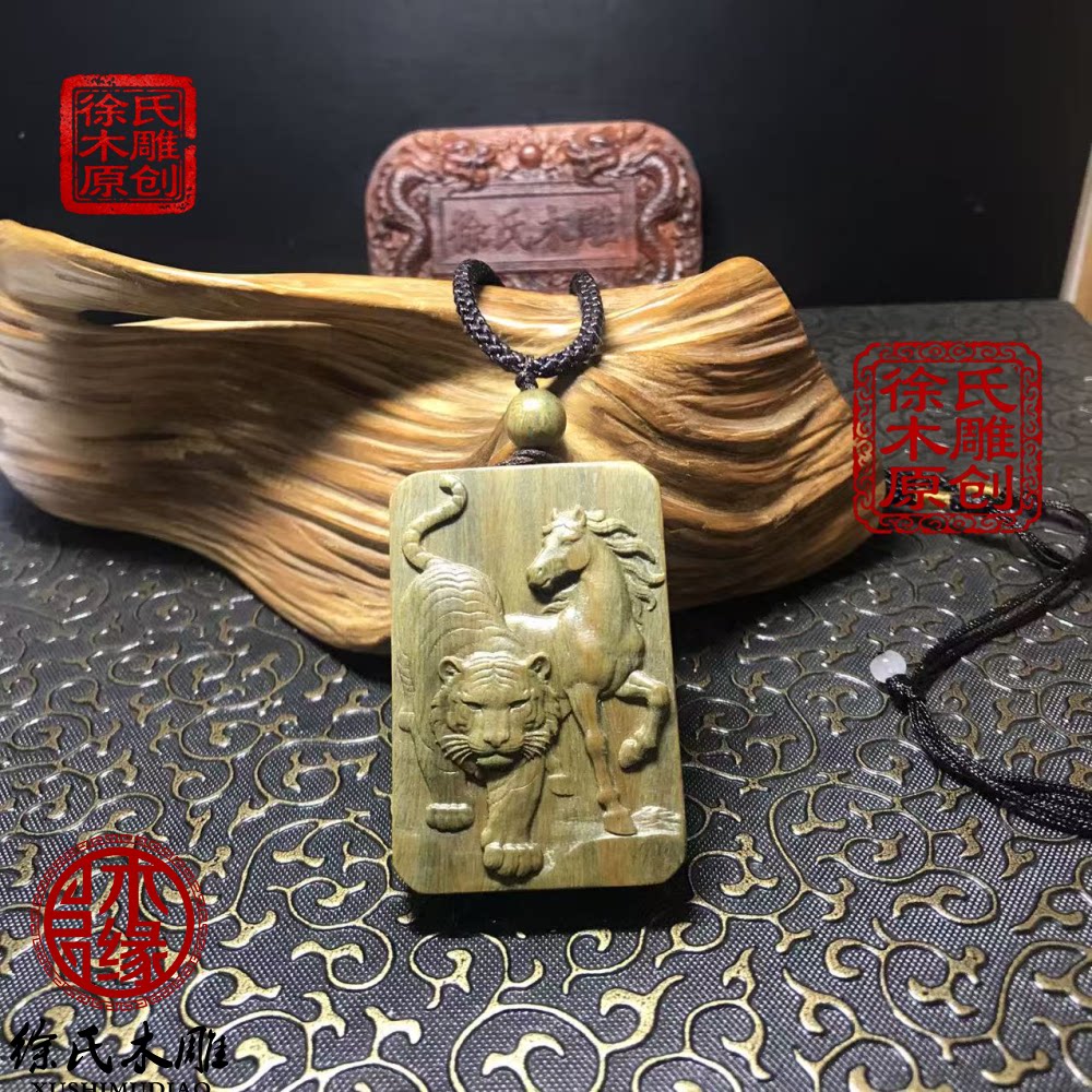 📚 原创天然绿檀木雕虎马寅午戌三合火局补火项链吊坠挂件牌子钥匙扣