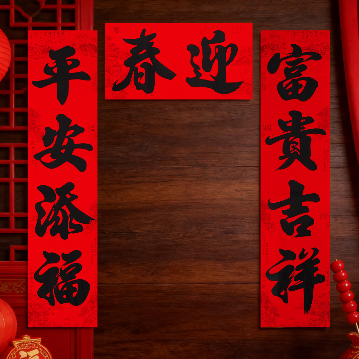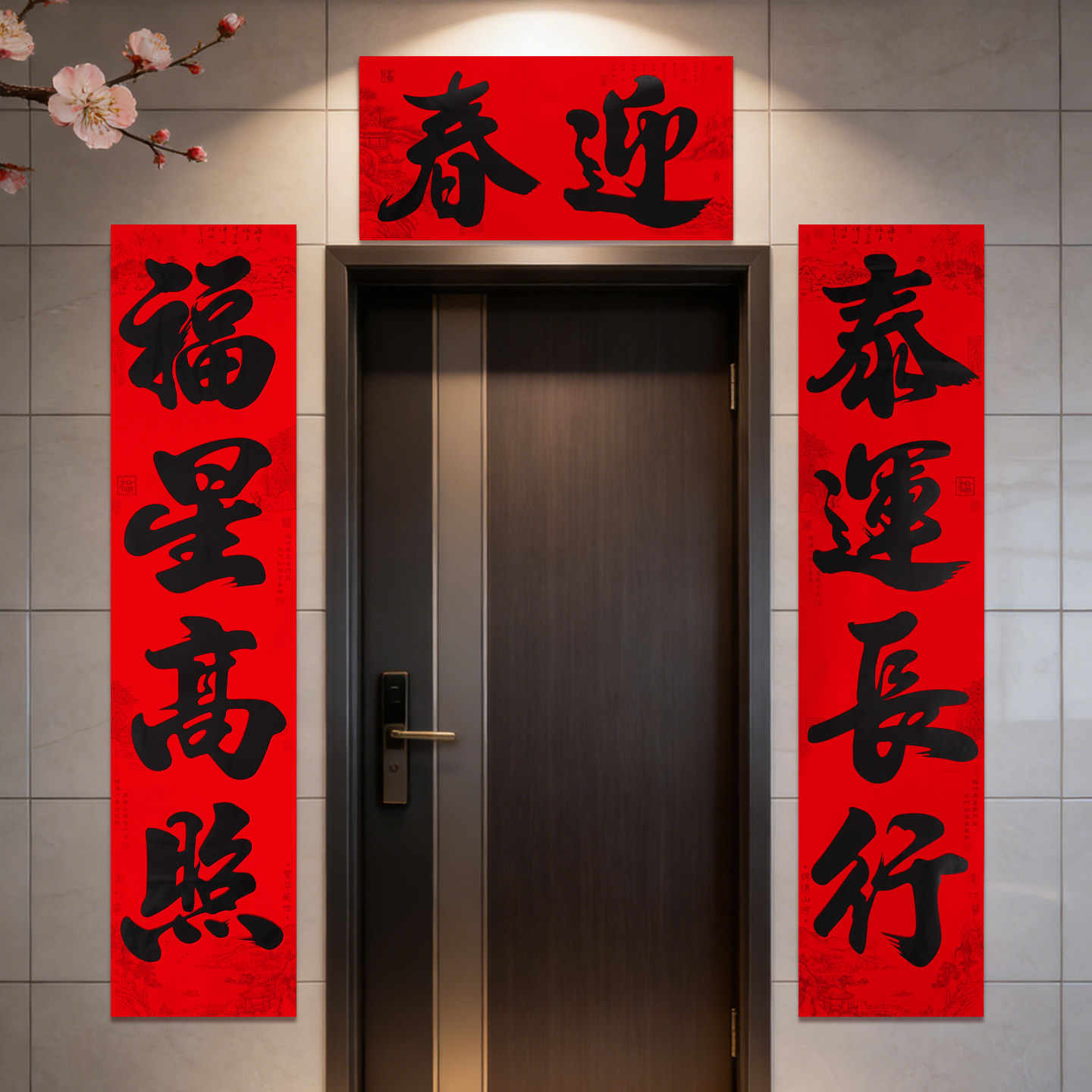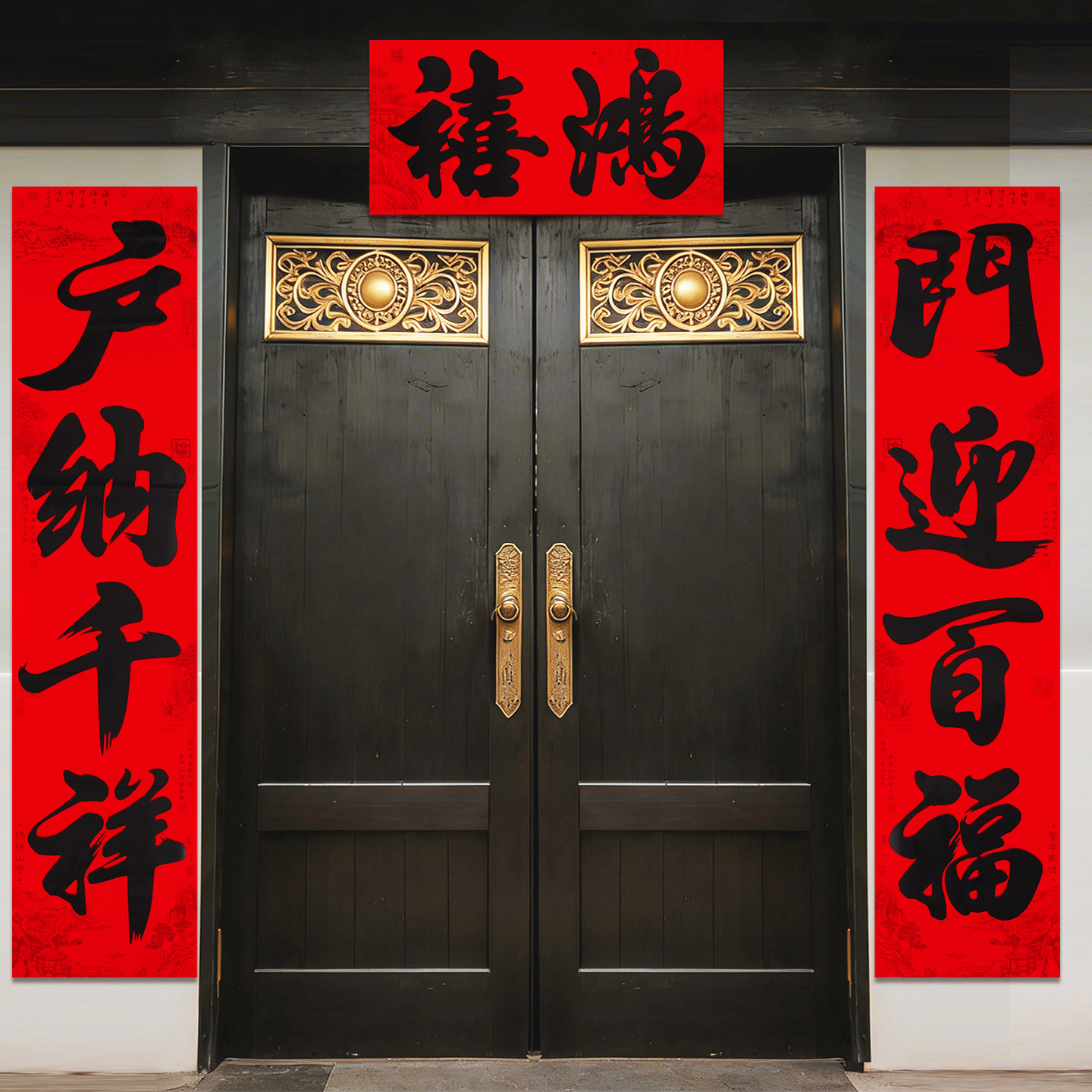 📚 四字大对联植绒背胶农村大门大号自粘双扇门别墅春联四言双开门对