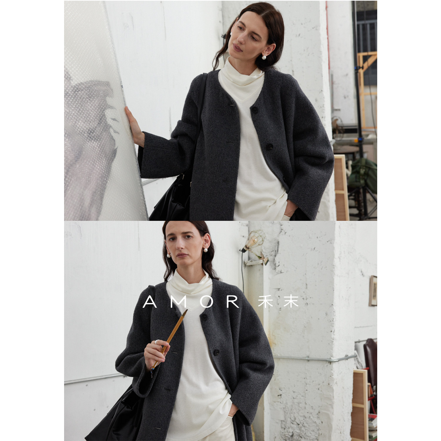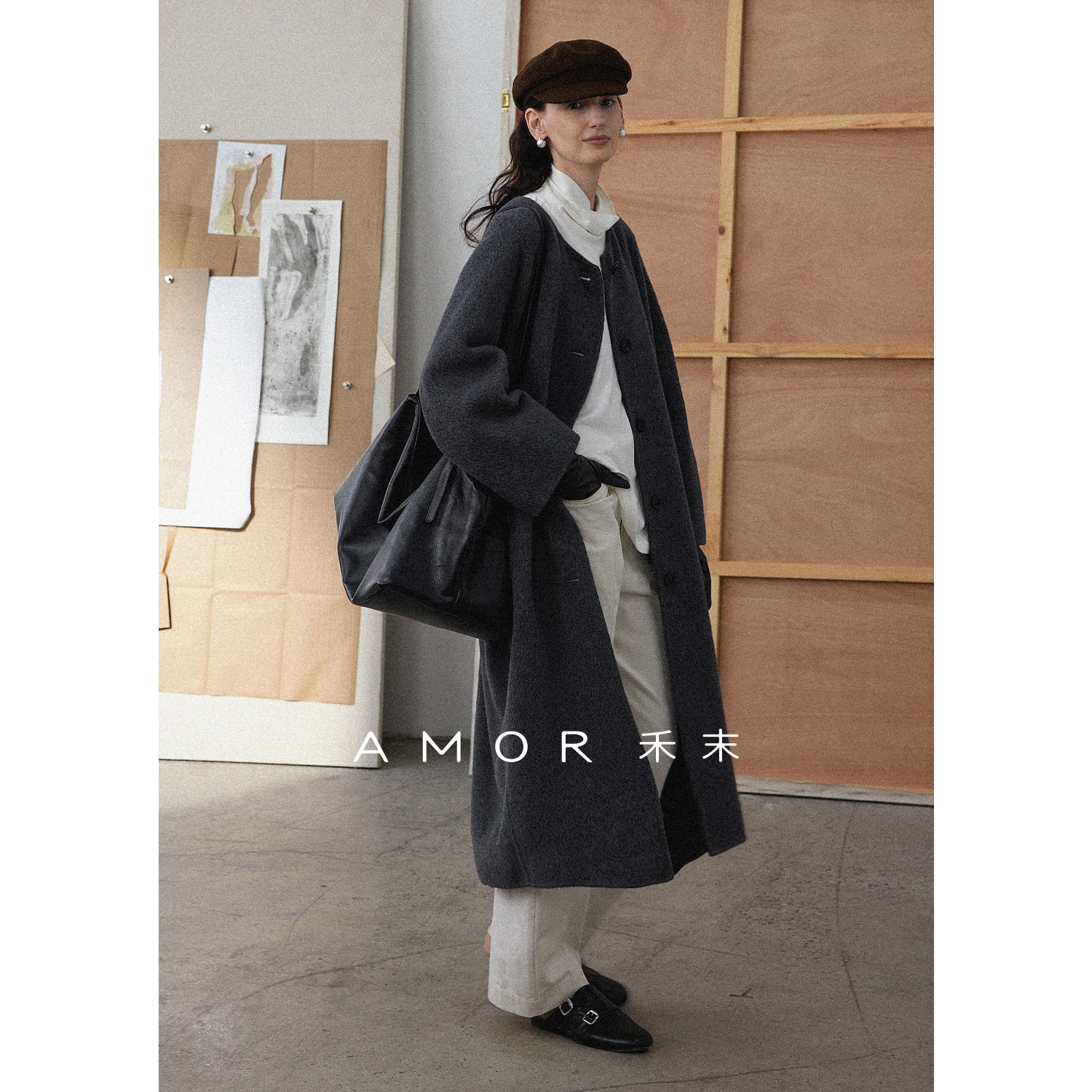 📚 AMOR禾末 “柏林晨报” 骆驼绒羊毛插肩袖长款双面呢圆肩无领大衣