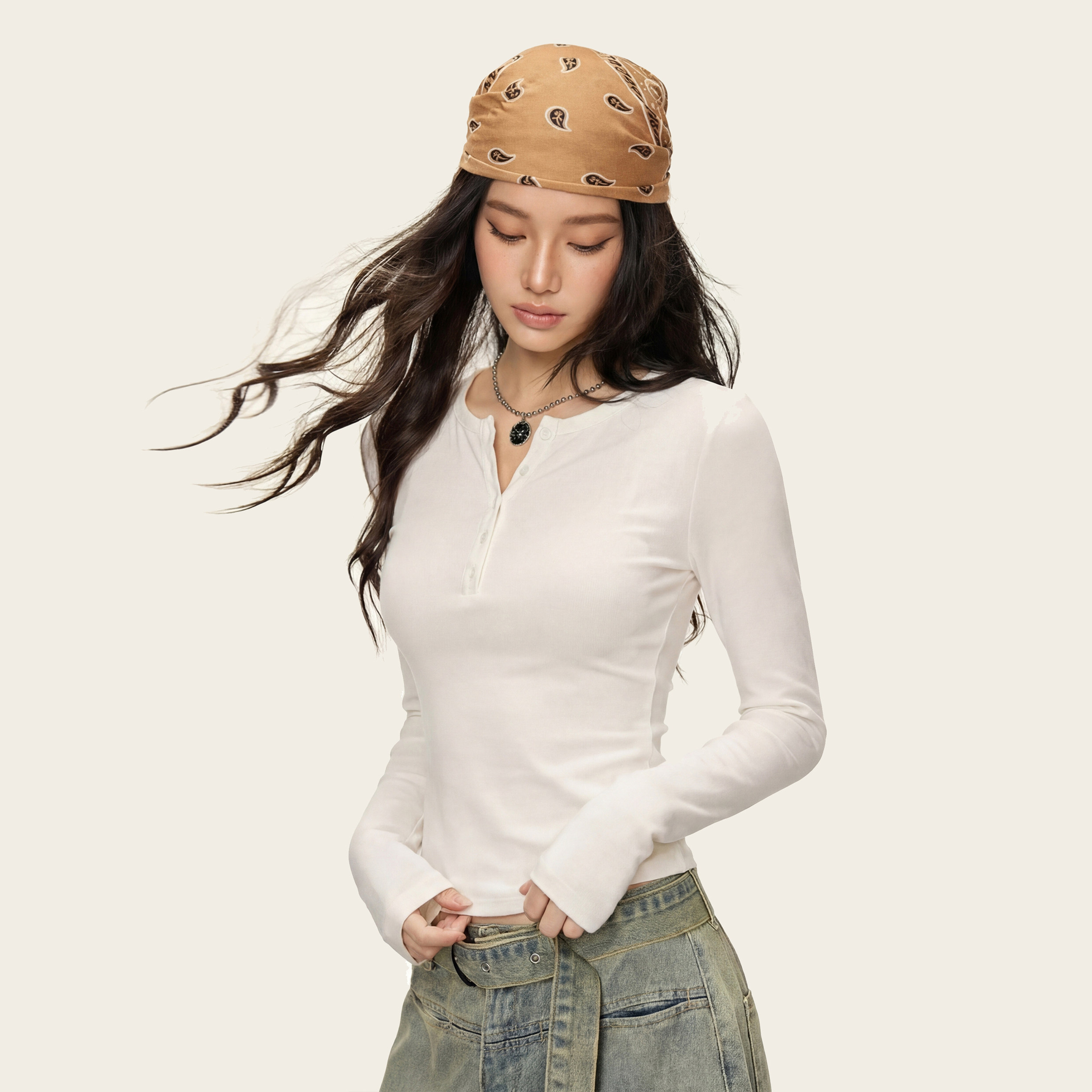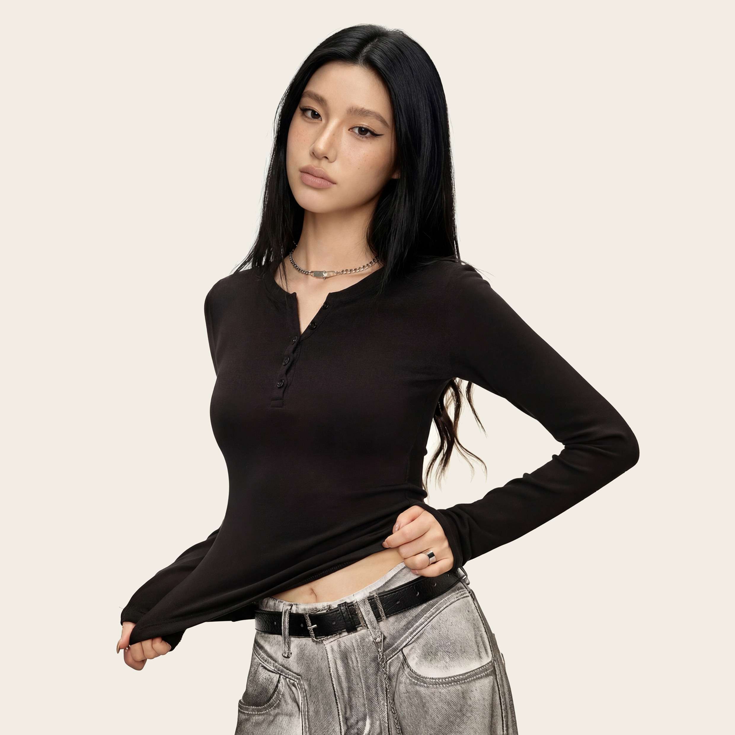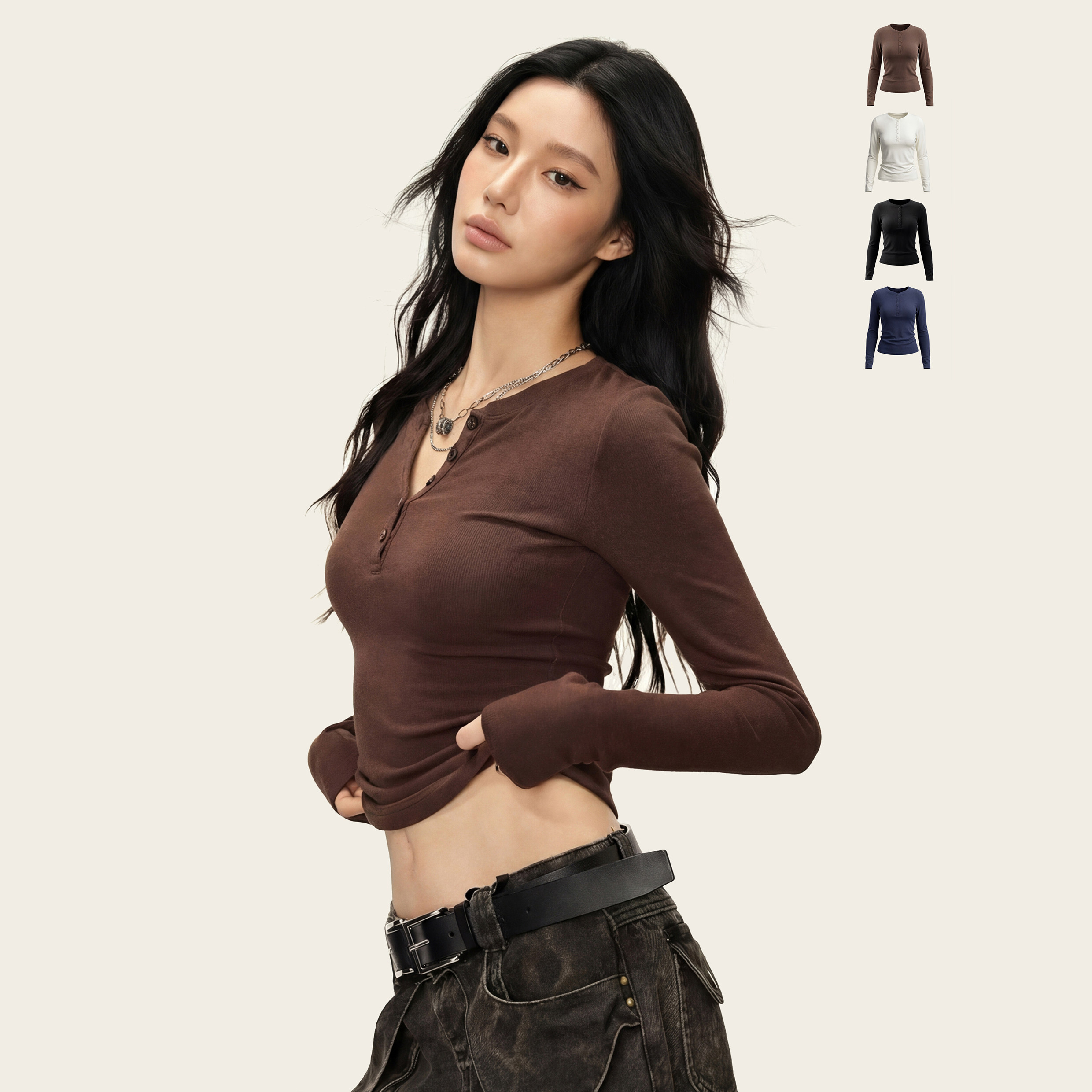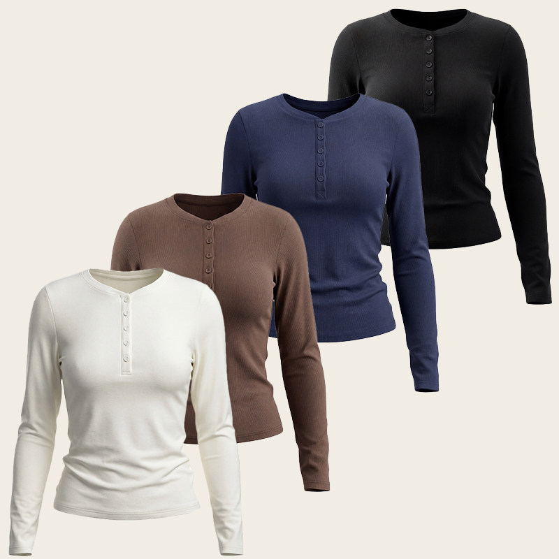 📚 Ames 美式复古辣妹【V领纽扣加绒长袖】春季修身显瘦打底衫上衣女