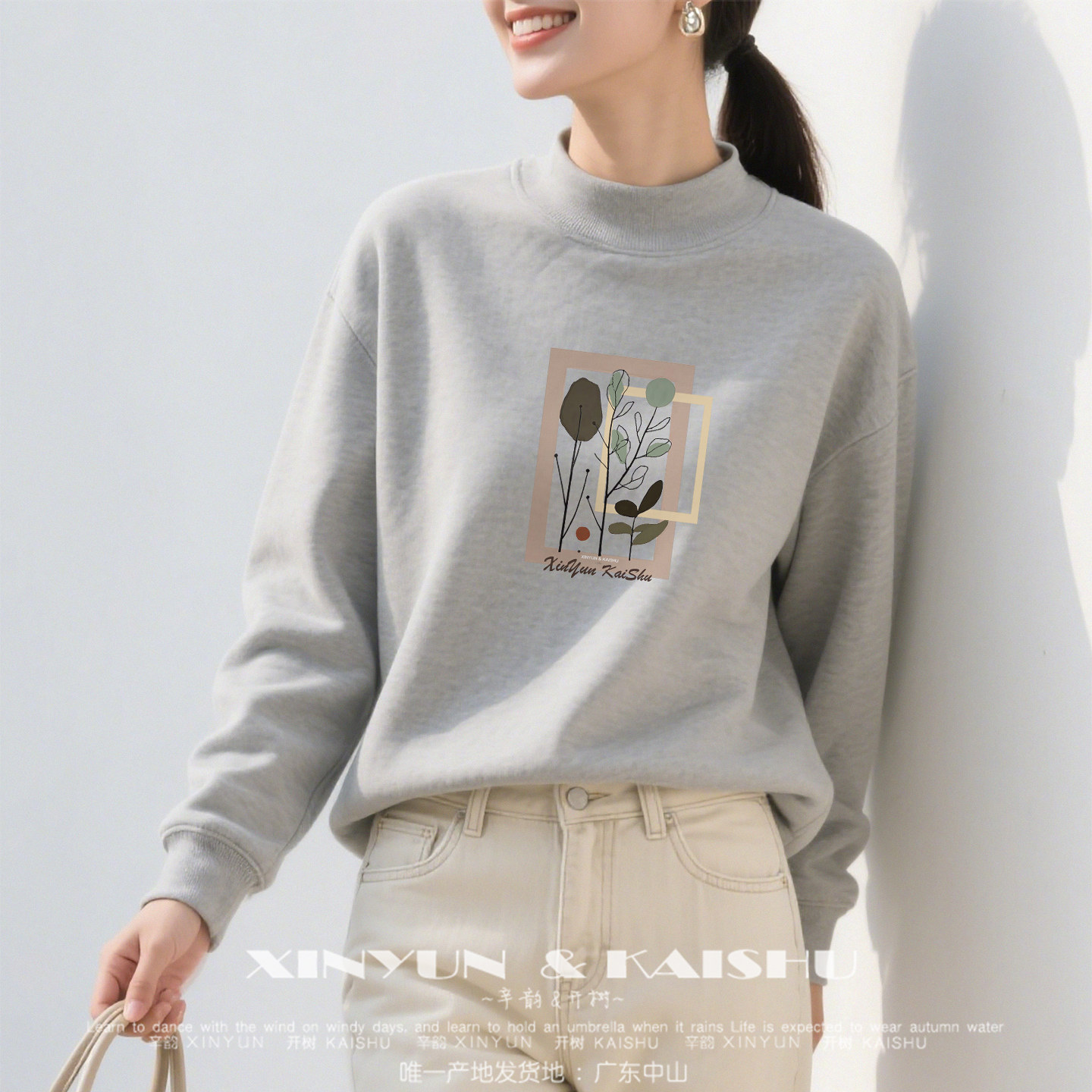 📚 纯棉半高领卫衣女宽松春秋季长袖上衣加绒秋冬打底衫灰色套头洋气