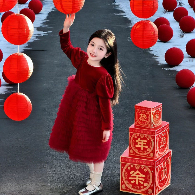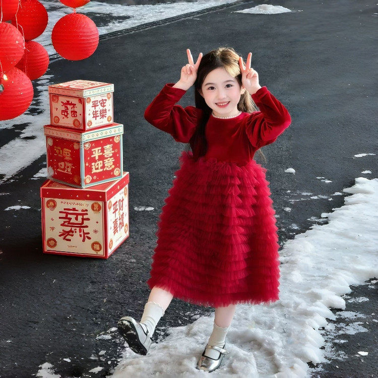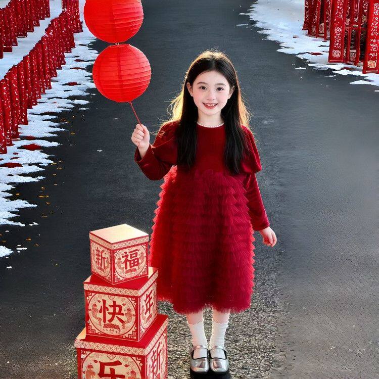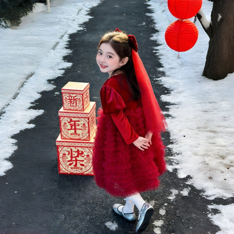 📚 2025新款冬季女童红色加绒连衣裙送头纱公主裙过年礼服裙子