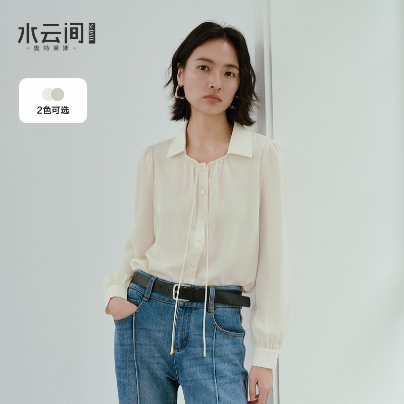 📚 水云间淡人穿搭方领长袖衬衫女式翻领系带衬衣雪纺衫通勤上衣2025