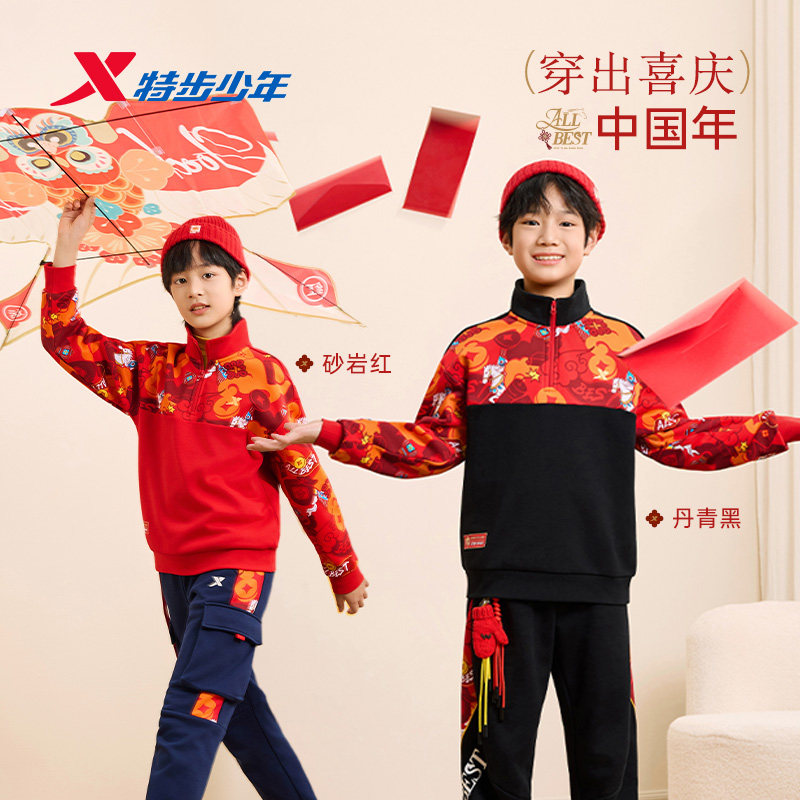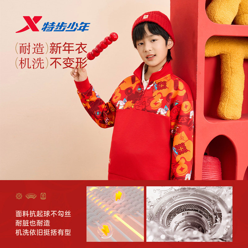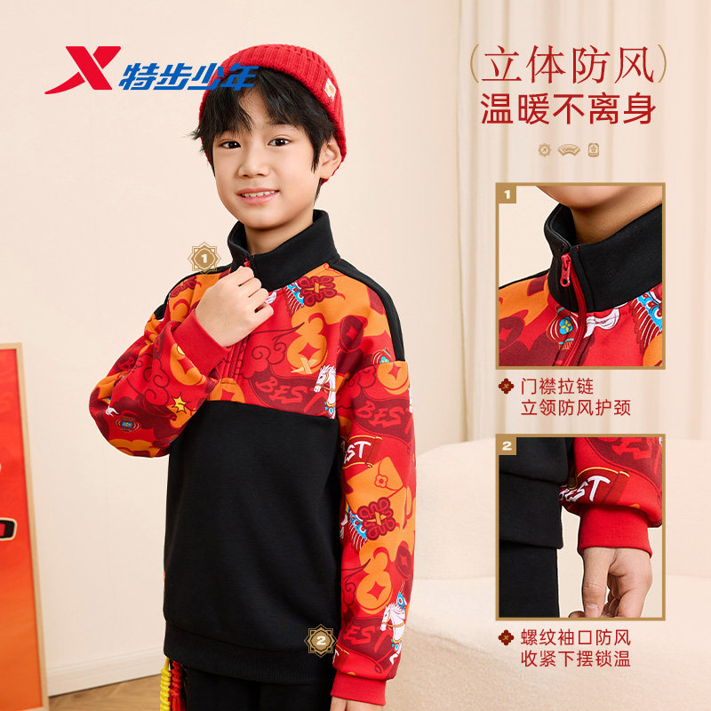📚 特步童装儿童卫衣男冬季2026新款半开衫遇到套头上衣加绒新年款马