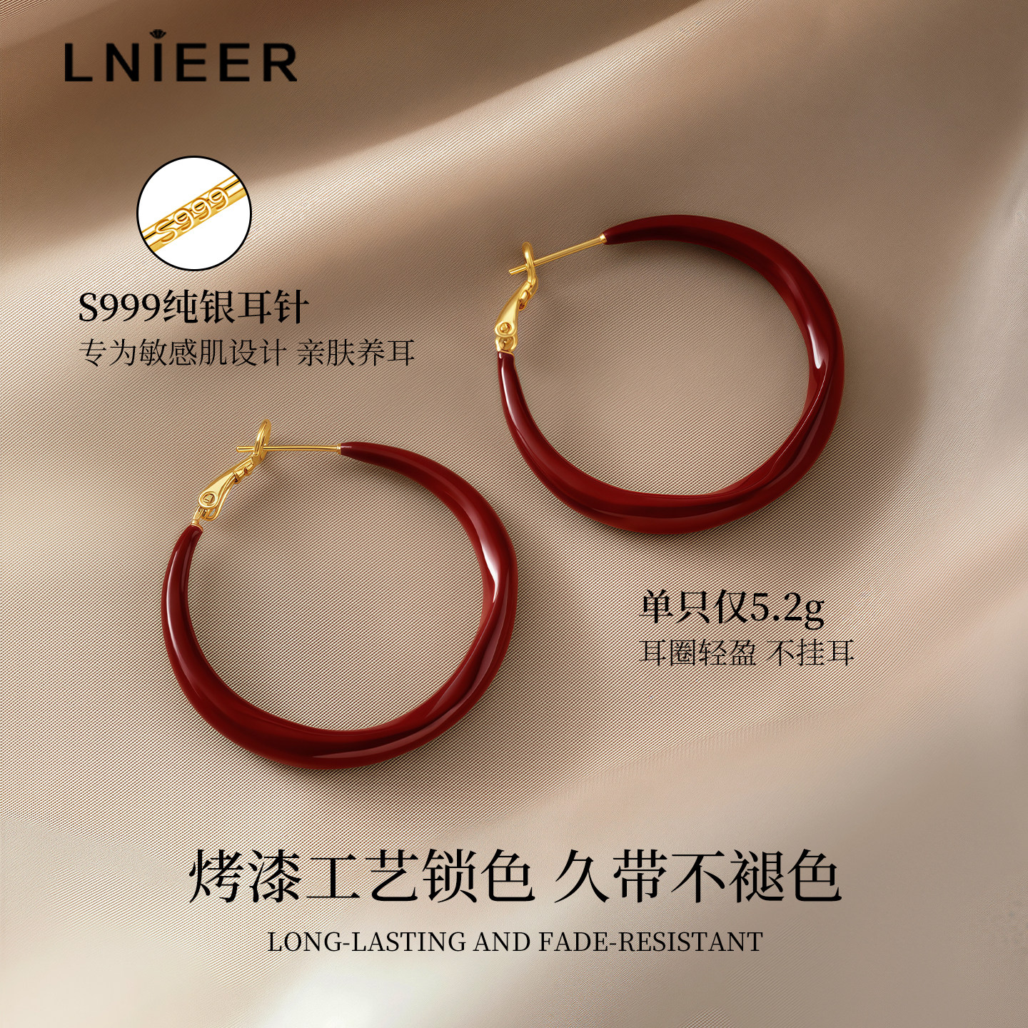 📚 999纯银针安可拉红圈圈耳环女气质耳圈复古港风新年红色秋冬耳饰