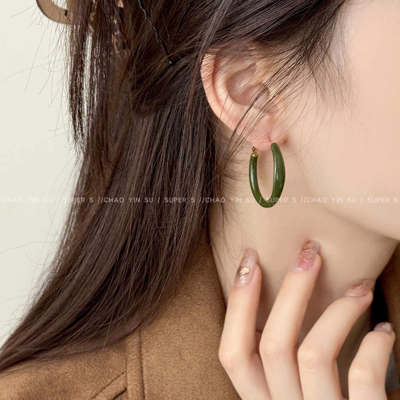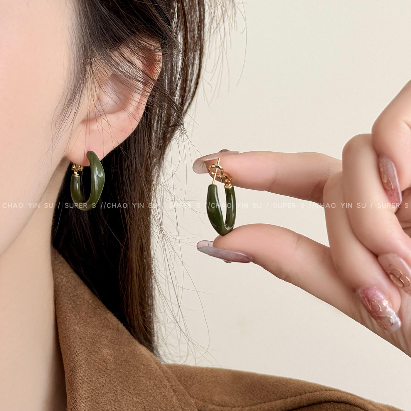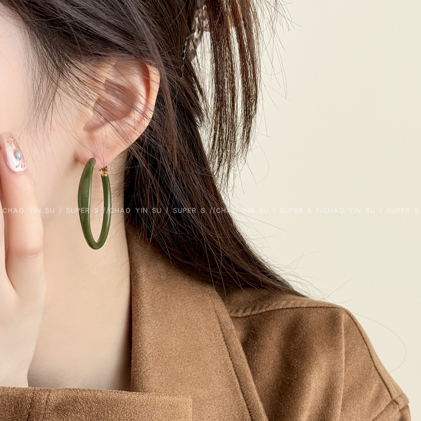 📚 复古港风橄榄绿素圈耳环女轻奢高级感气质大圈耳圈时尚百搭耳饰品
