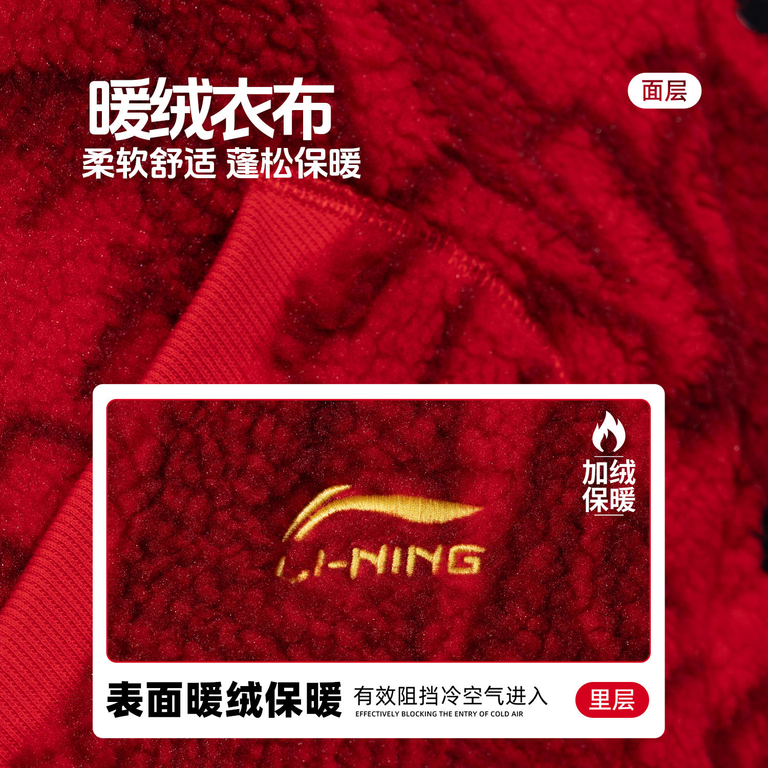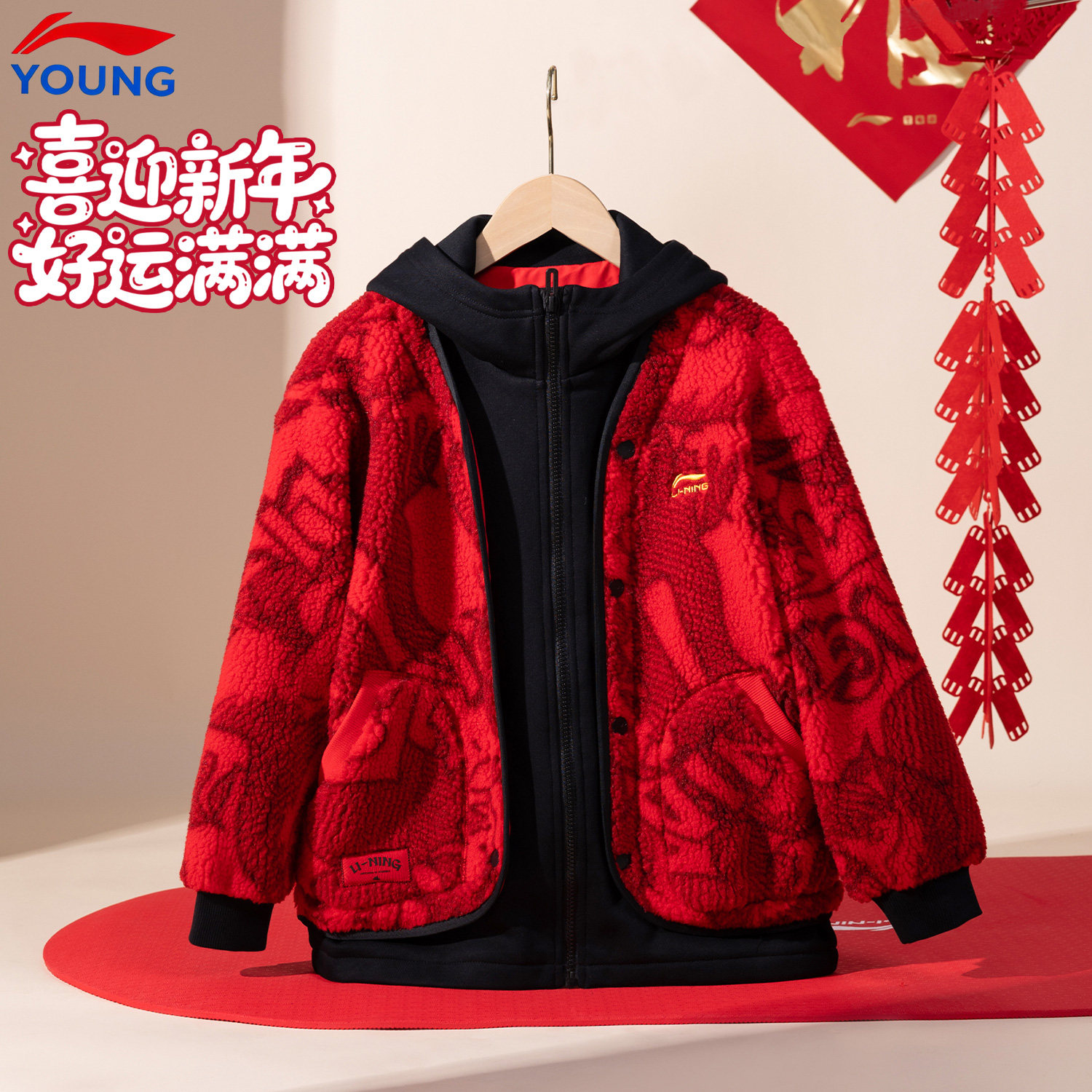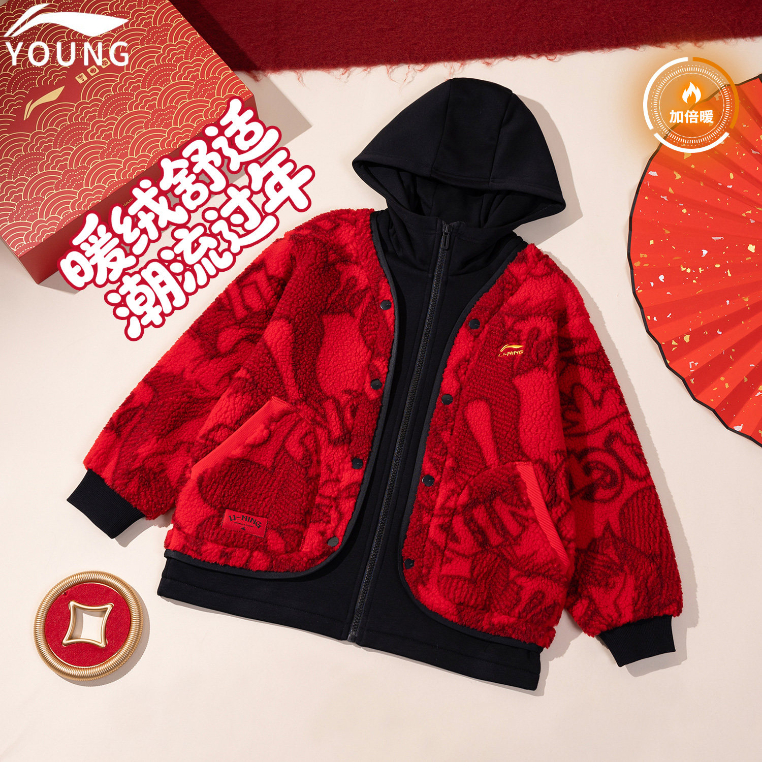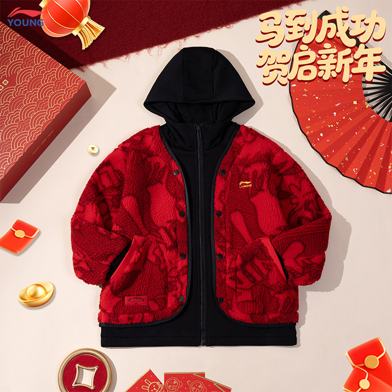 📚 李宁官方旗舰正品男童加绒外套加绒保暖红色外套26年新年装本命年