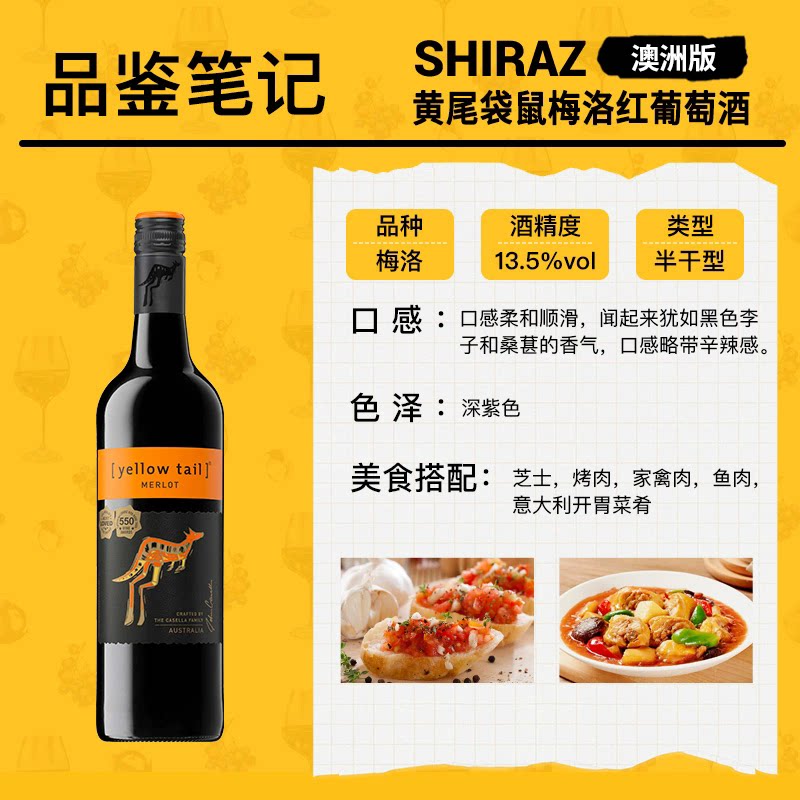 📚 yellow tail/黄尾袋鼠 澳洲系列加本力西拉梅洛霞多丽1瓶红酒尝鲜