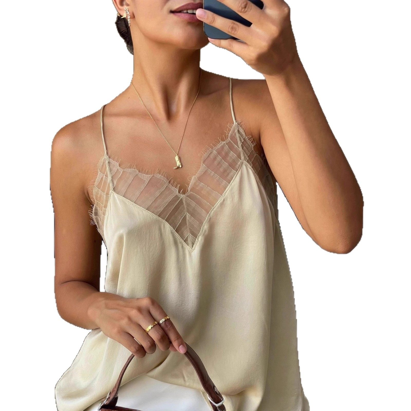 📚 法式冰丝吊带背心打底衫蕾丝V领无袖内搭上衣 Lace camisole vest
