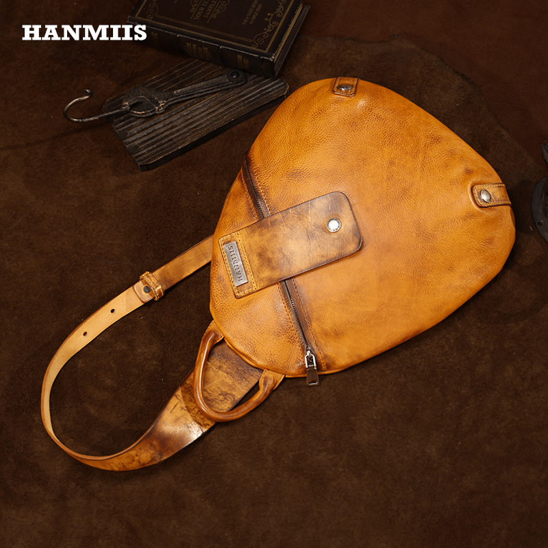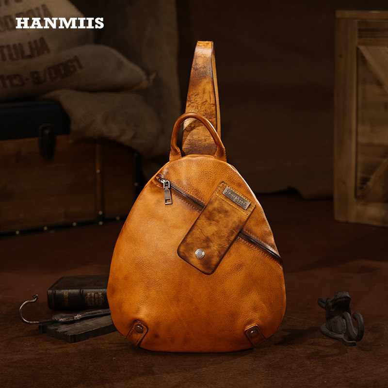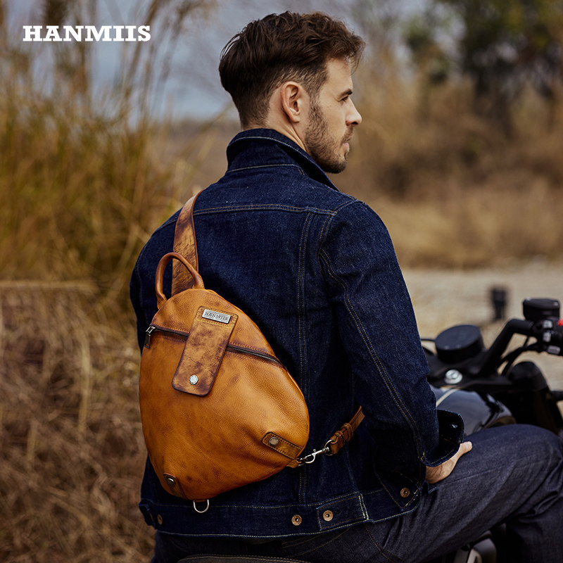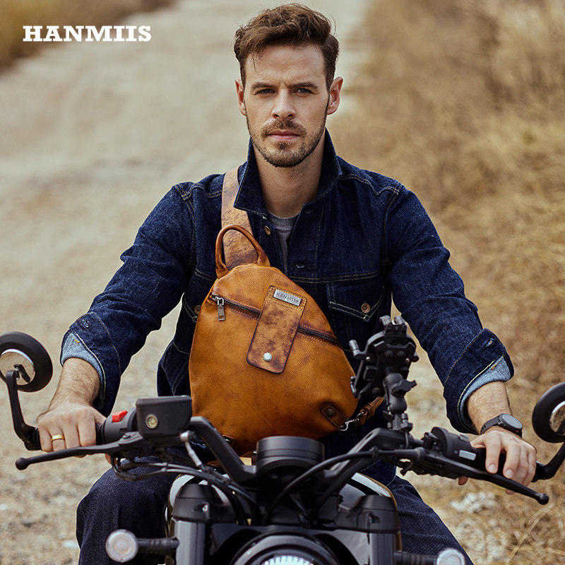 📚 HANMIIS空降兵B6真皮胸包机车户外骑行包头层牛皮斜挎包手工男包