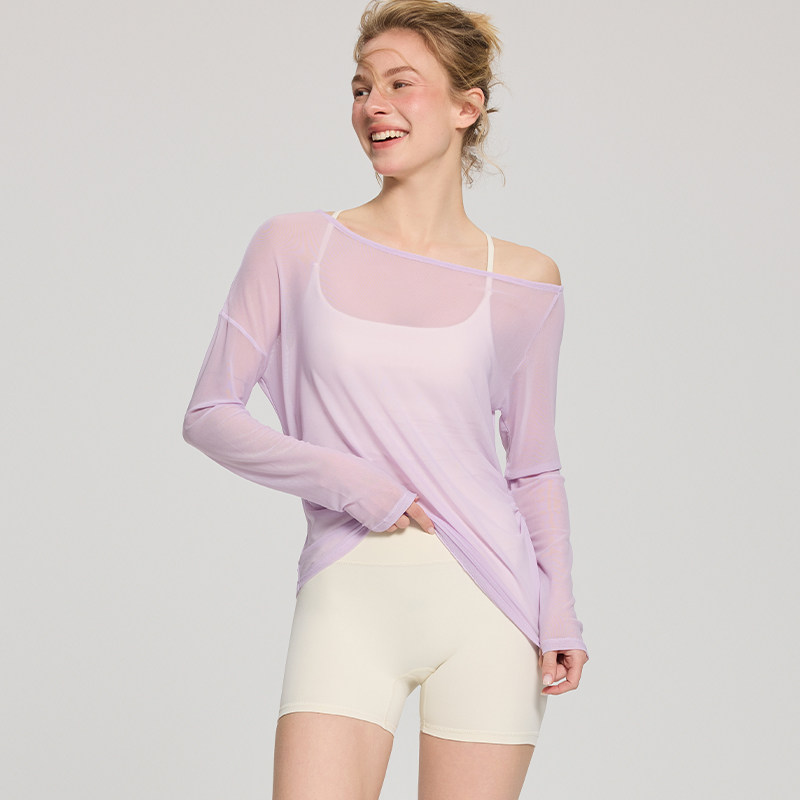 📚 Willowind瑜伽服女透气网纱长袖T恤高弹轻薄健身服斜肩长袖T恤