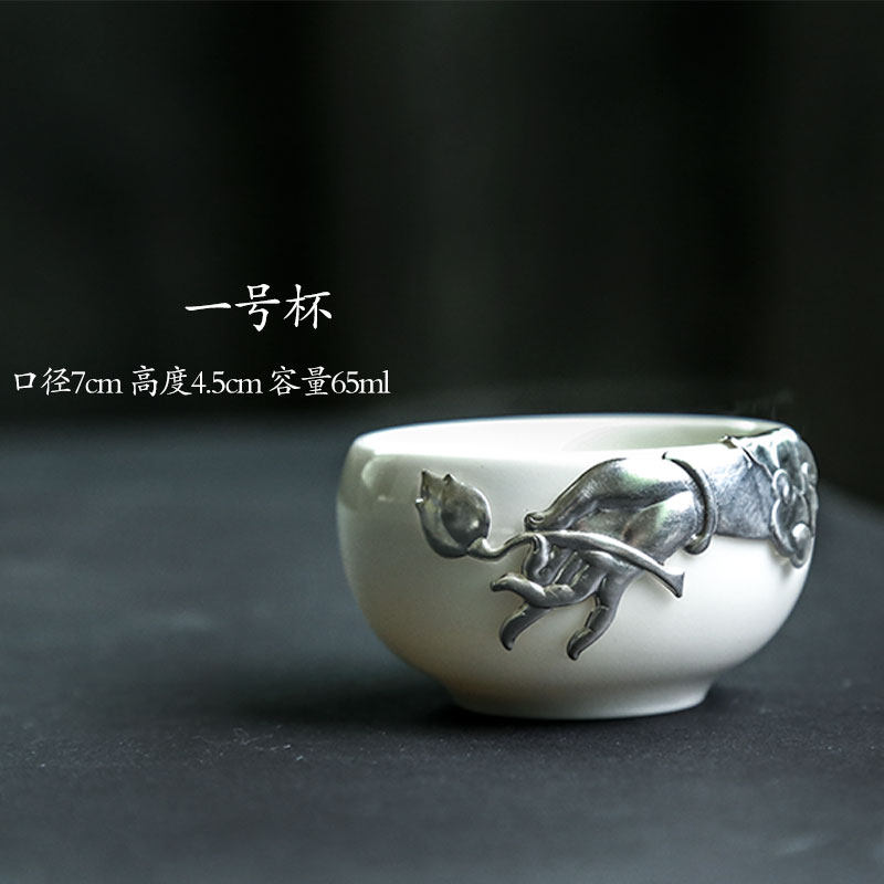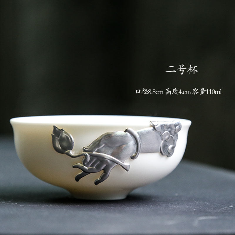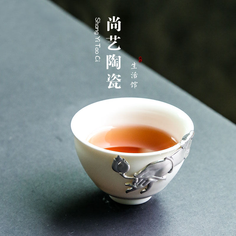 📚 玉白釉手工镶银陶瓷茶杯品茗杯茶盏碗养生银鱼功夫茶具单杯主人杯