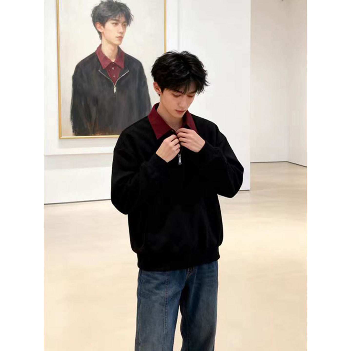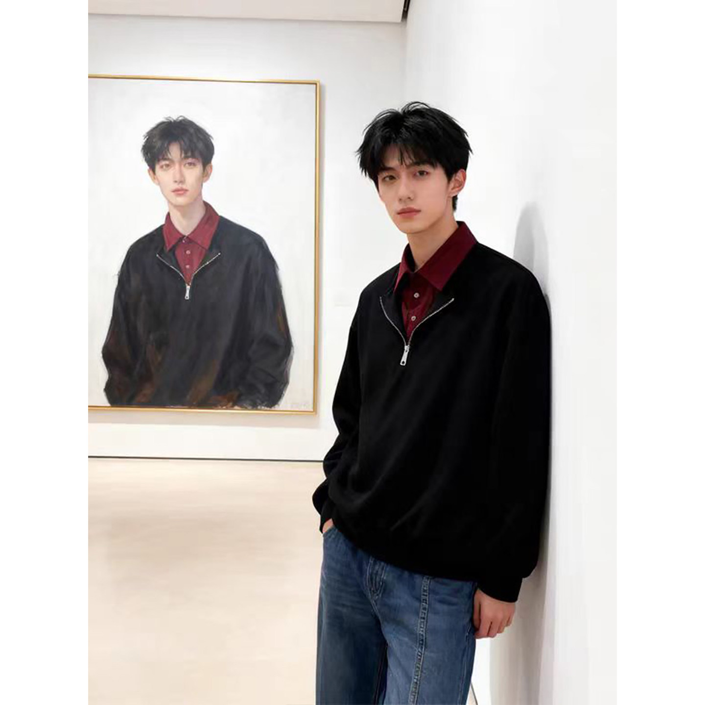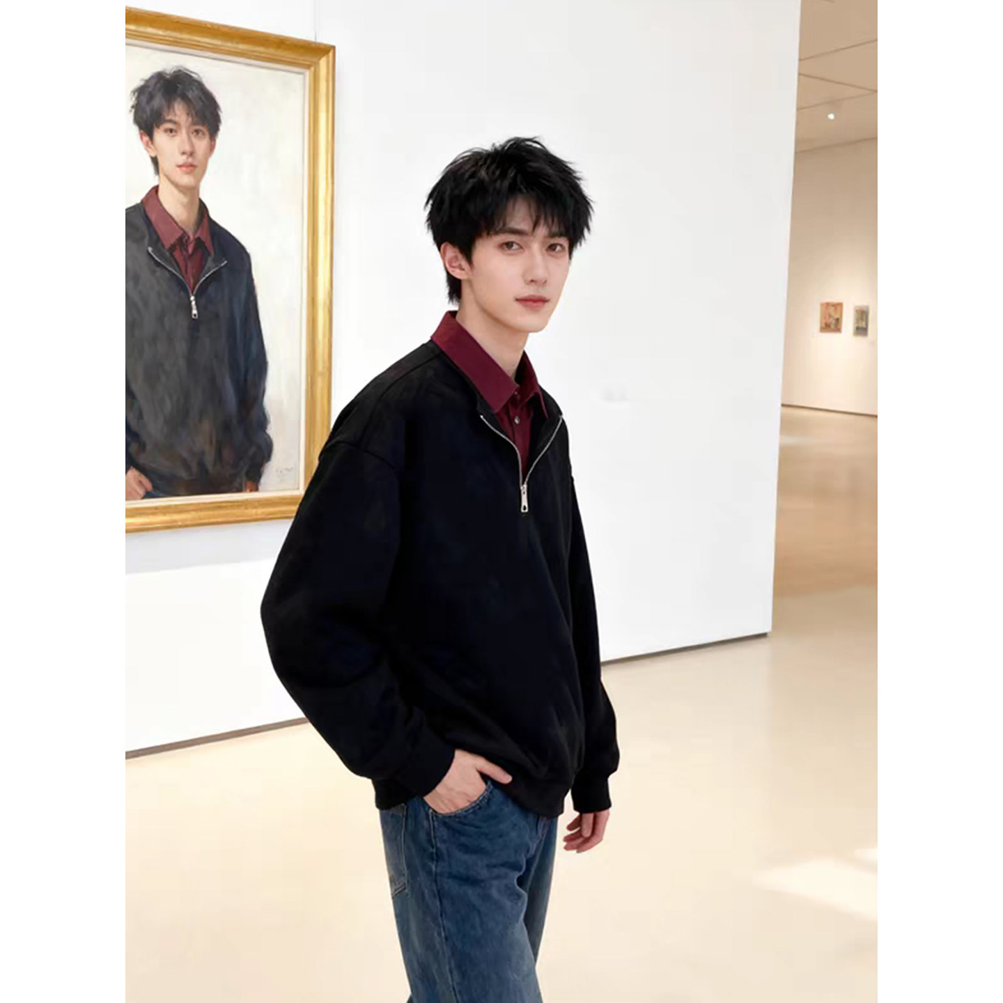 📚 假两件半拉链衬衫领卫衣男款春季学院风内搭POLO上衣美式正肩外套