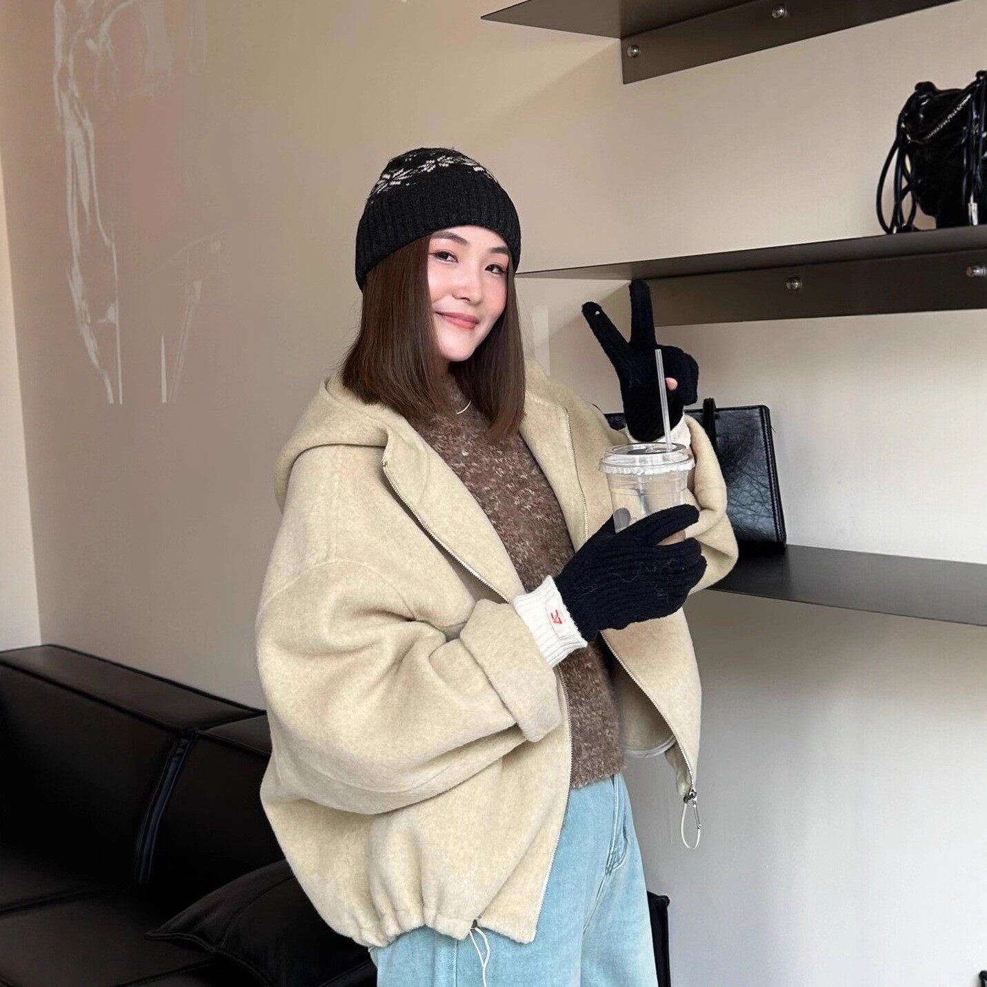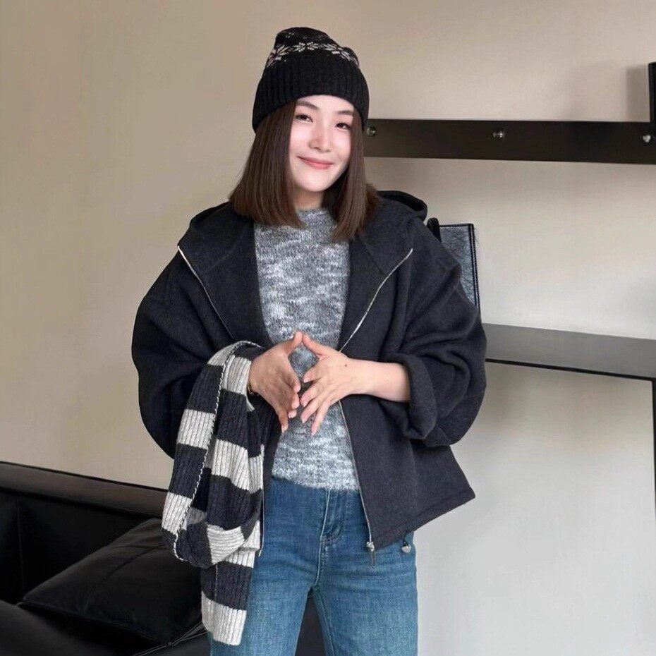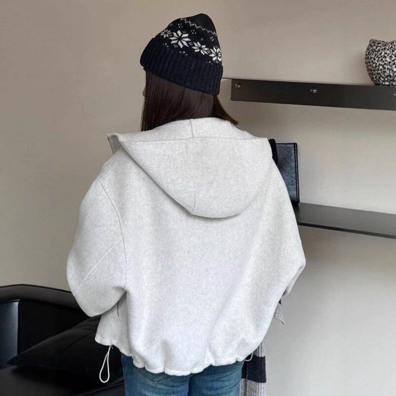 📚 连帽抽绳拉链机车款式双面羊毛大衣短款宽松加厚保暖羊毛毛呢外套