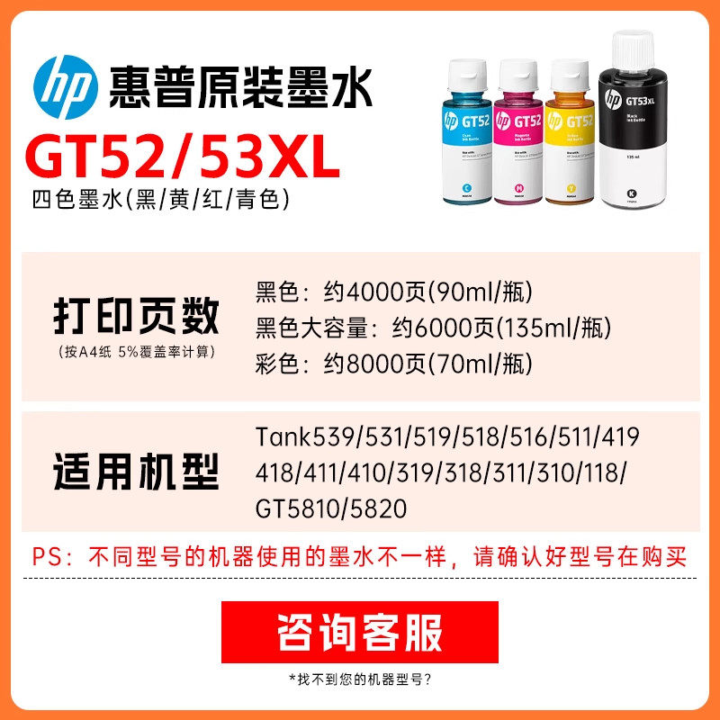 📚 惠普原装GT53XL黑色GT52/51XL彩色墨水tank582 676 510 519 531 672 726 755 593 588 598 599 592 215打印机