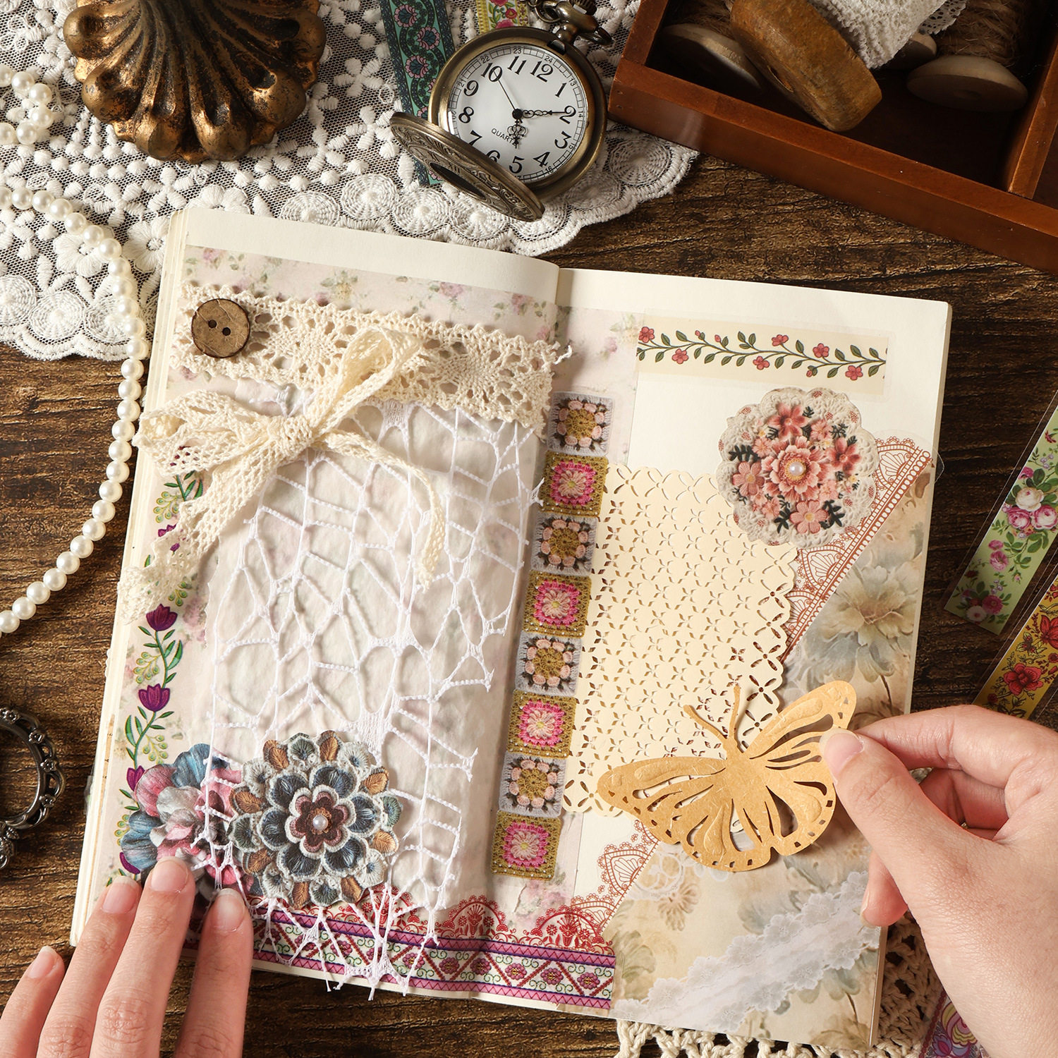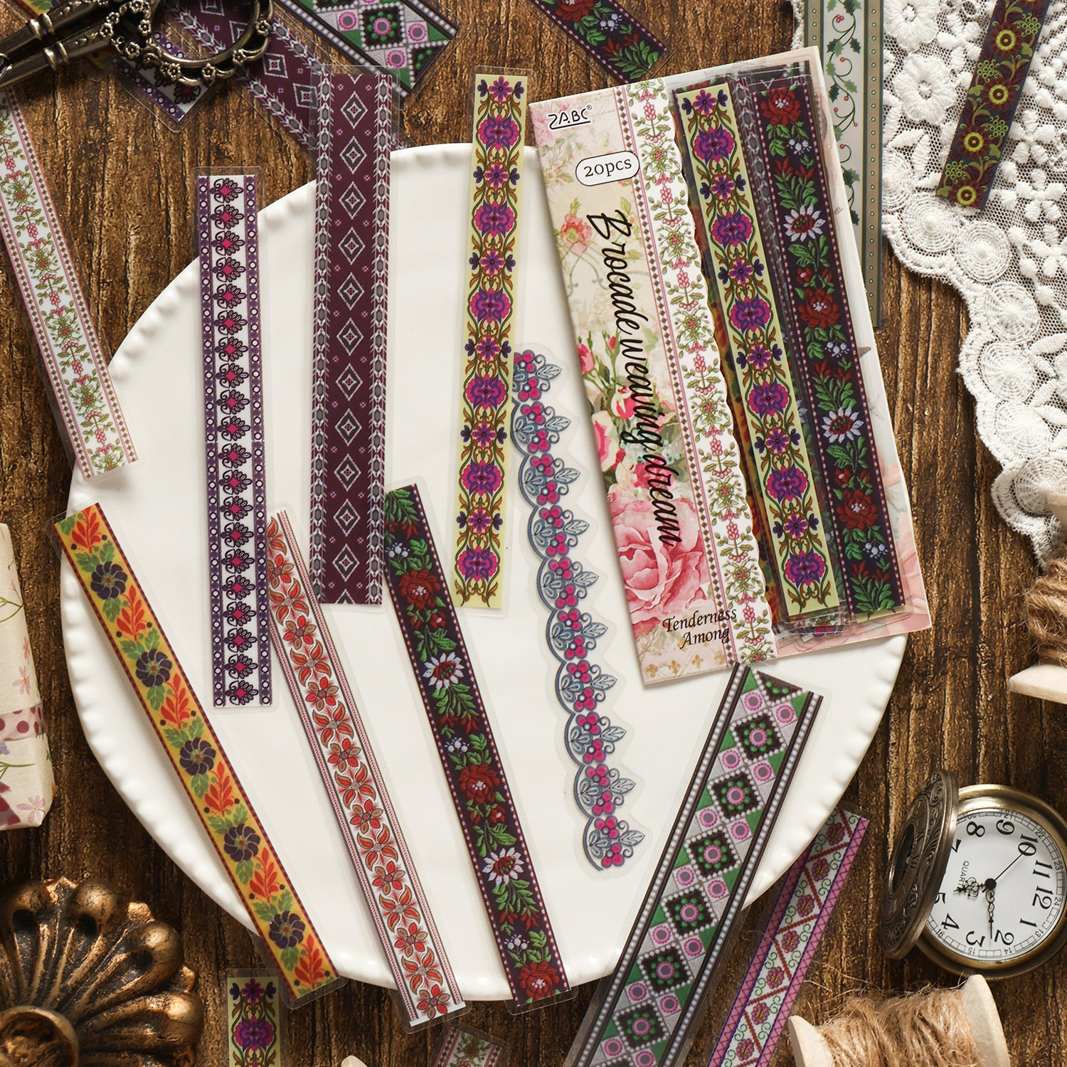 📚 花间缱绻系列长条贴纸包 复古ins蝴蝶结蕾丝花边DIY拼贴装饰贴画