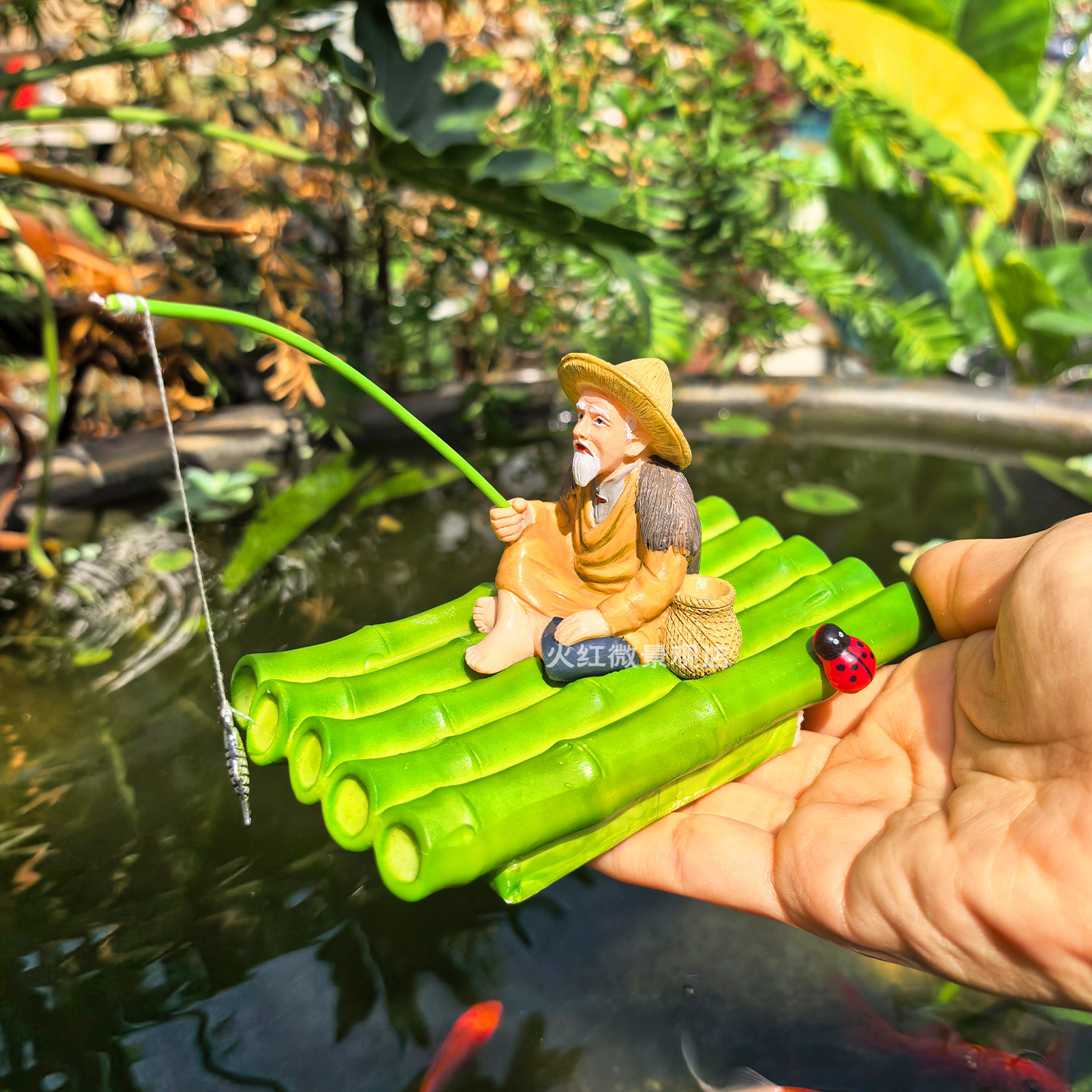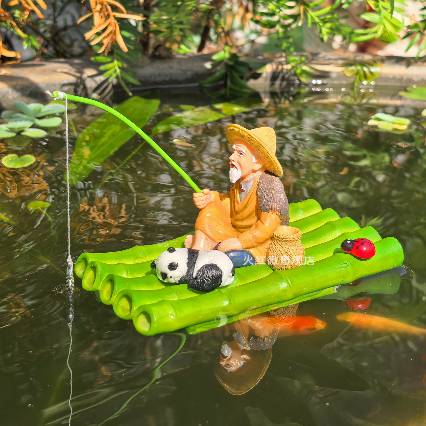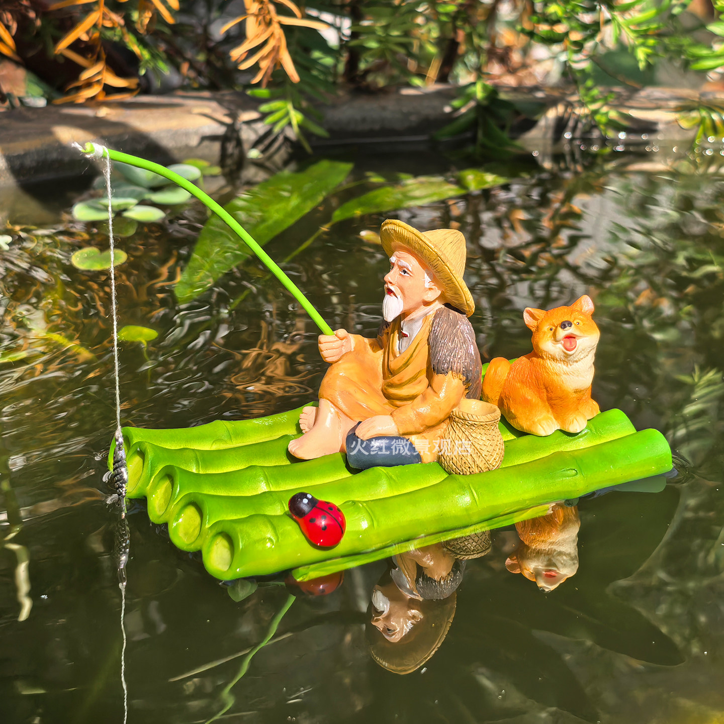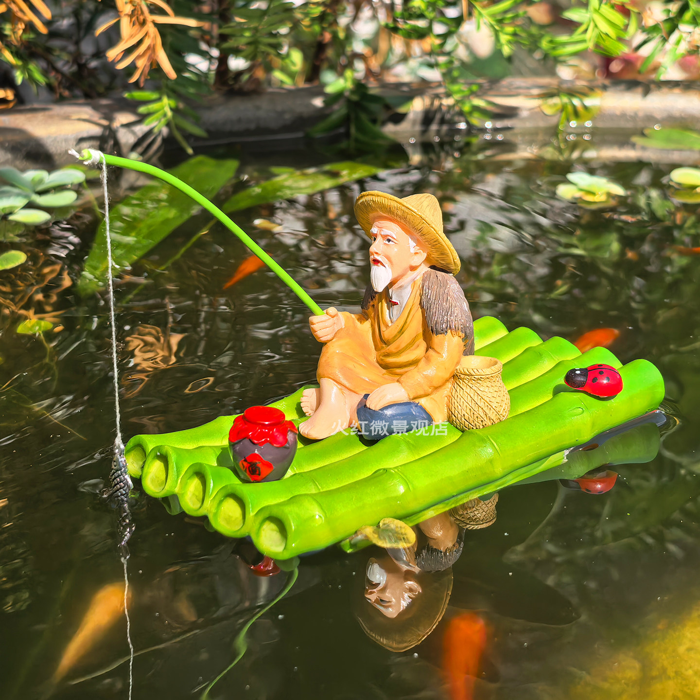 📚 可漂浮竹筏竹排姜太公钓鱼翁摆件庭院古法水缸鱼缸造景悬浮喂食器