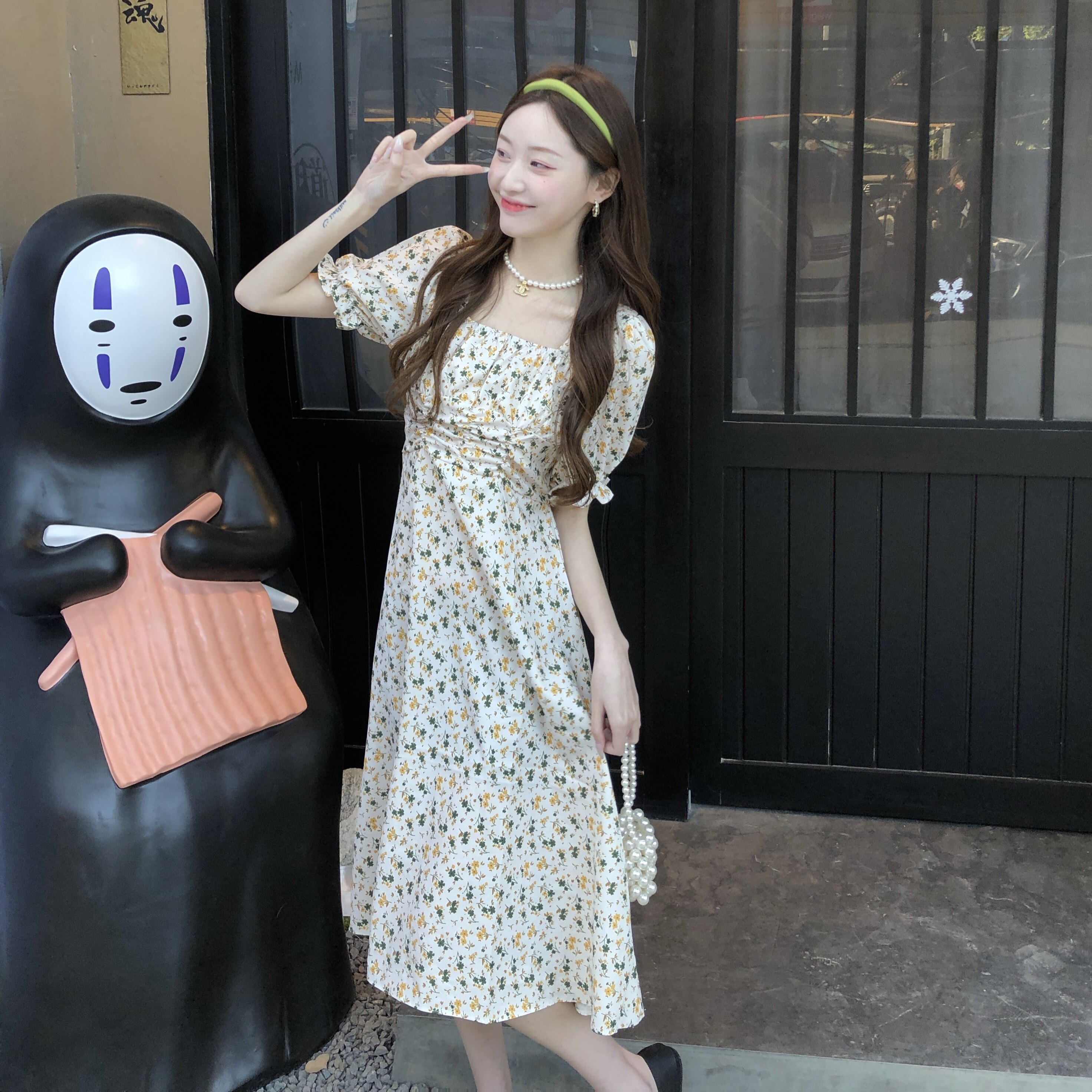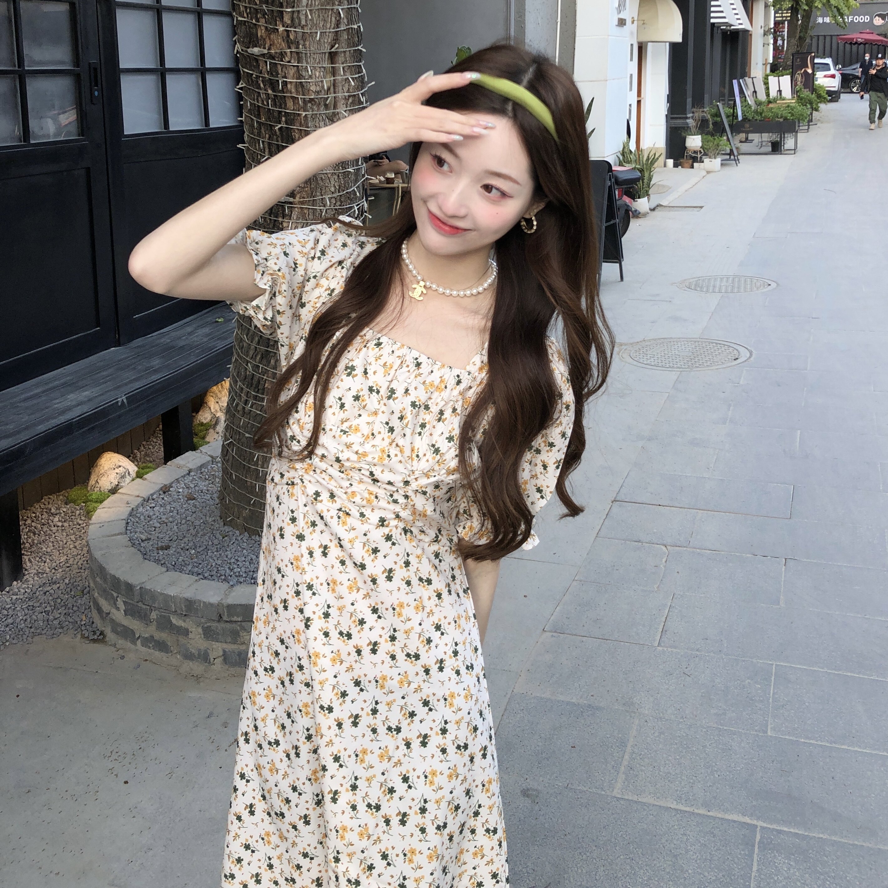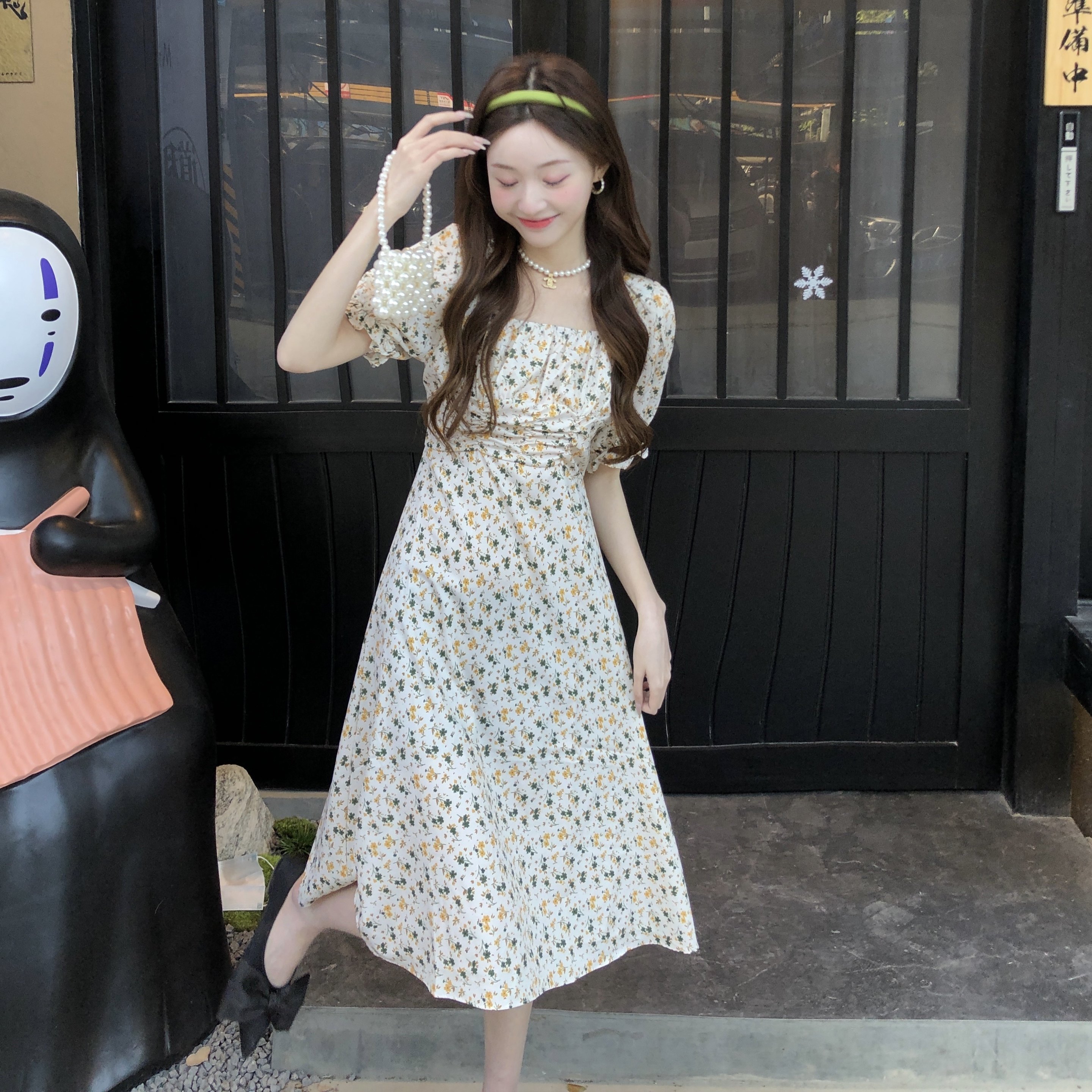 📚 145矮小个子碎花短袖连衣裙150cm法式方领收腰中长款裙子女XS码夏