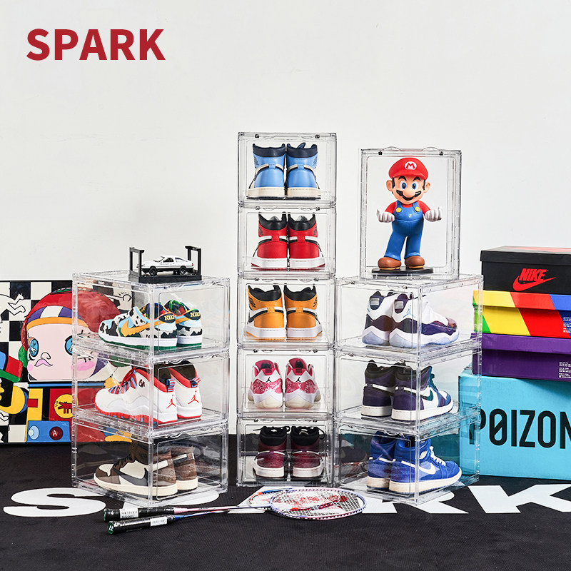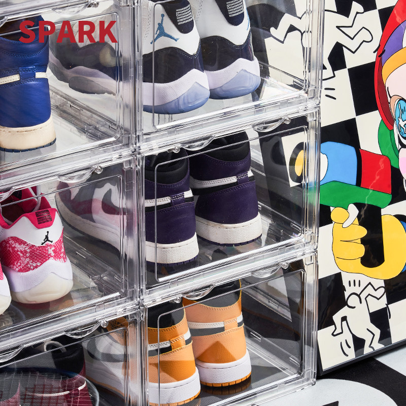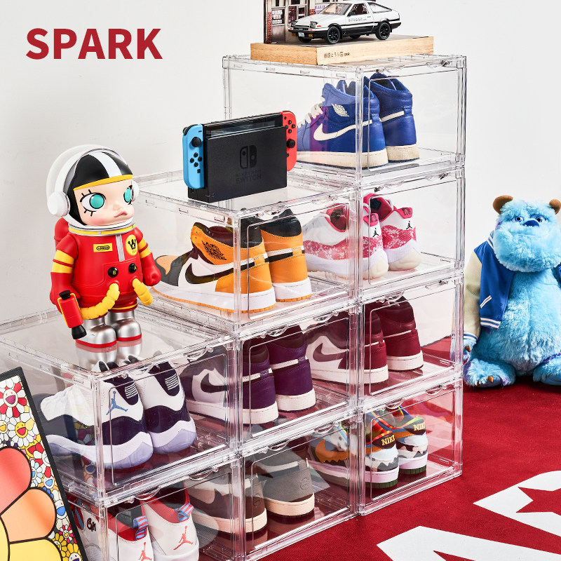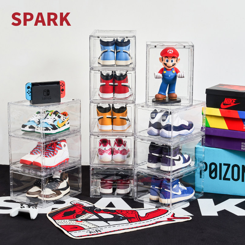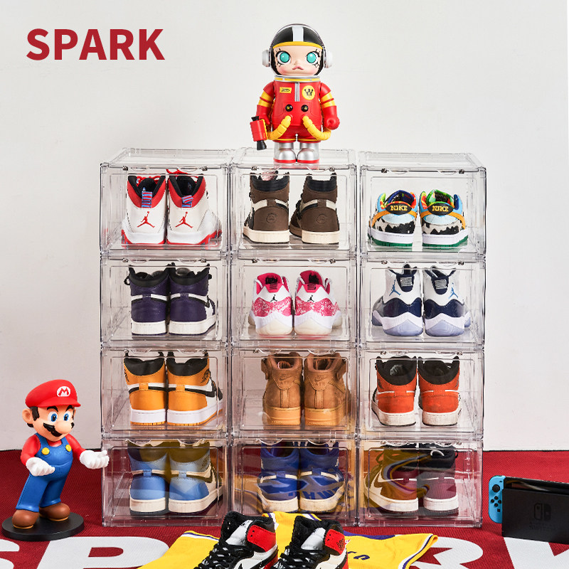 📚 正开压克力鞋盒透明硬塑料加厚球鞋防氧化防尘磁吸折叠鞋柜收纳盒