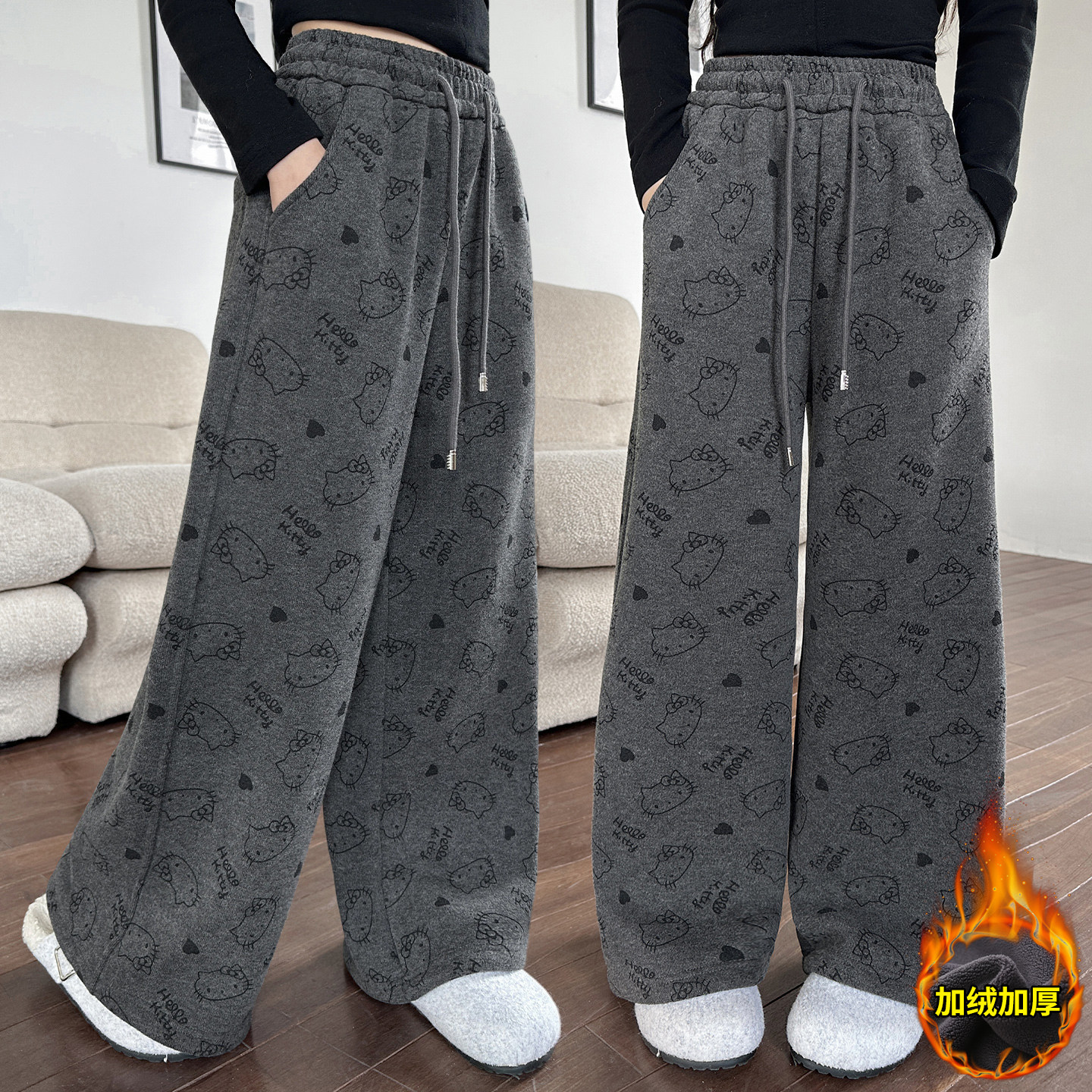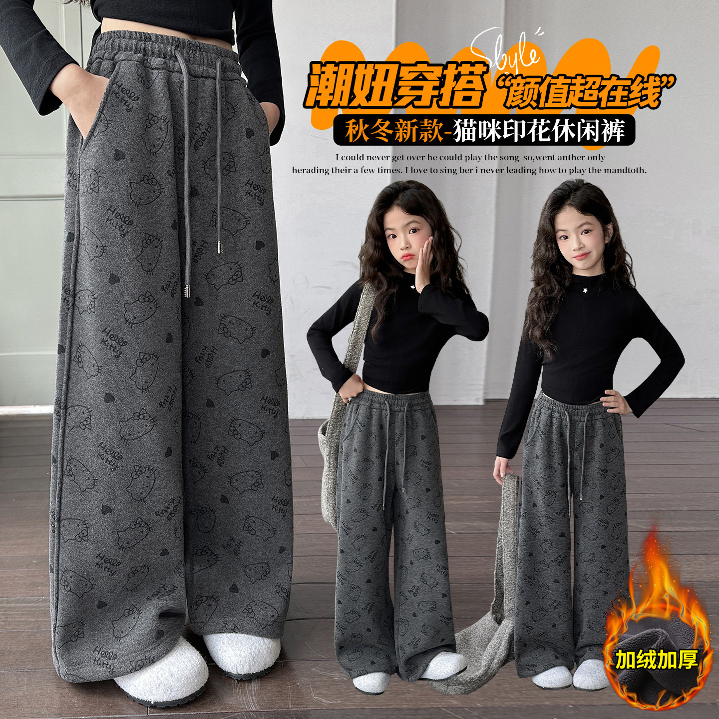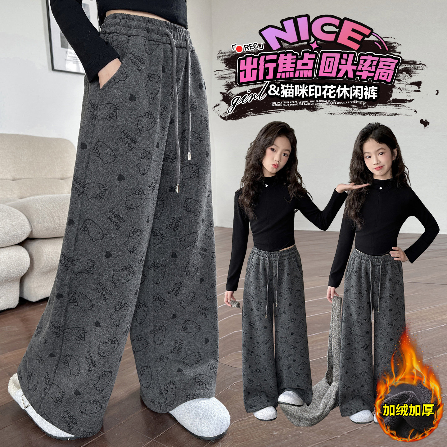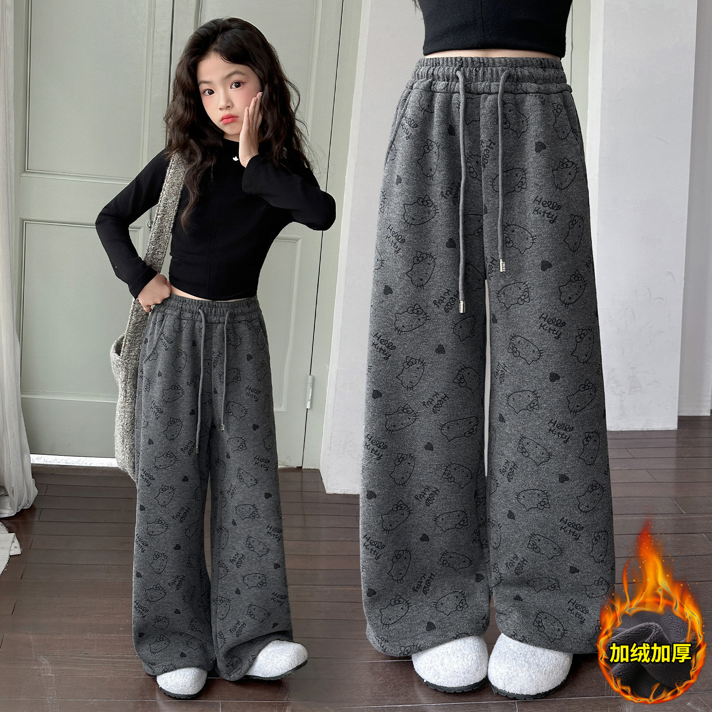 📚 女童卫裤冬季加绒新款儿童卡通满印休闲宽松中大童洋气运动阔腿裤