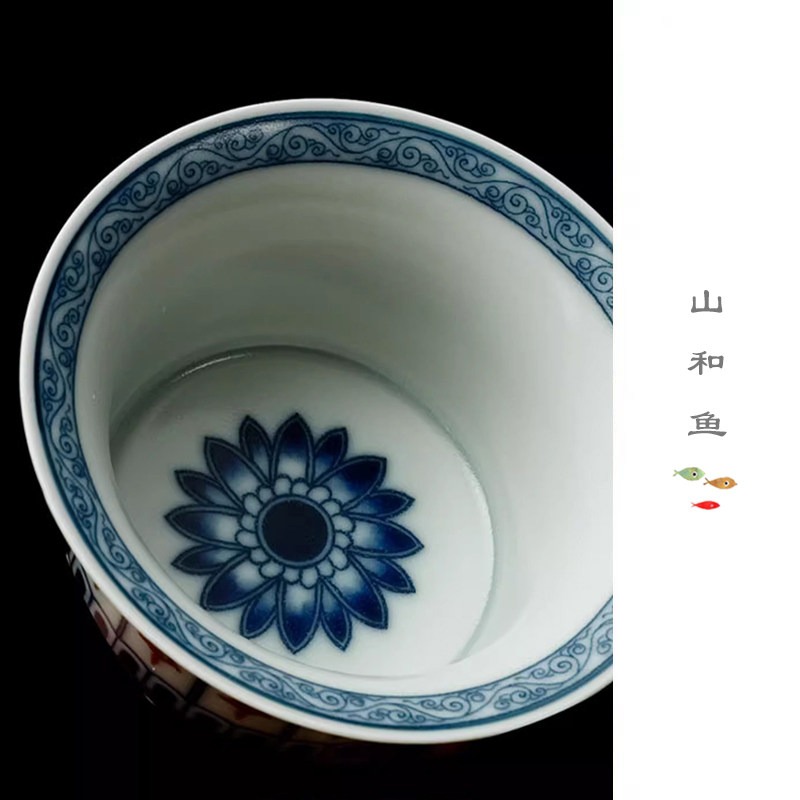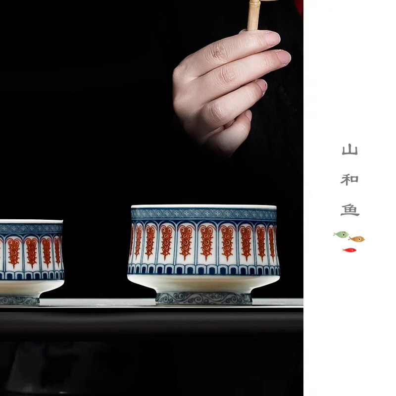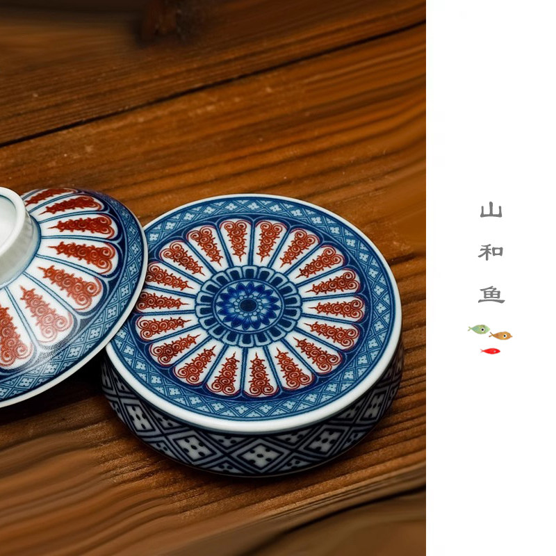 #陶瓷仿古 #泥青花釉里红 #卷草纹三才盖碗 #中式家用功夫茶杯壶承 #优惠活动
