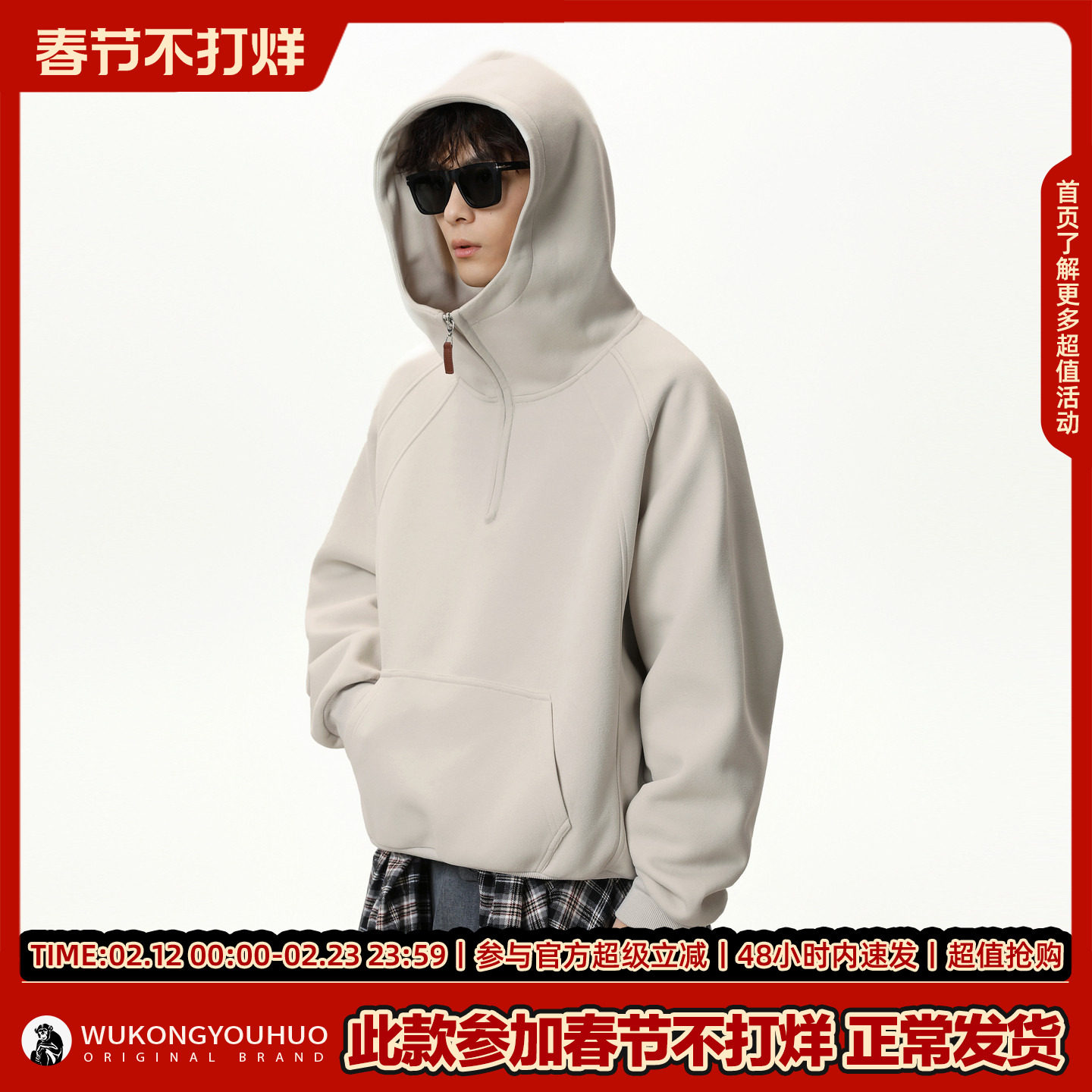 📚 悟空有货潮牌美式解构拼接重磅半拉链卫衣男复古情侣宽松连帽上衣