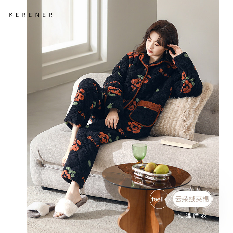📚 可人儿睡衣女冬季三层夹棉加厚加绒保暖珊瑚绒开衫棉袄家居服套装