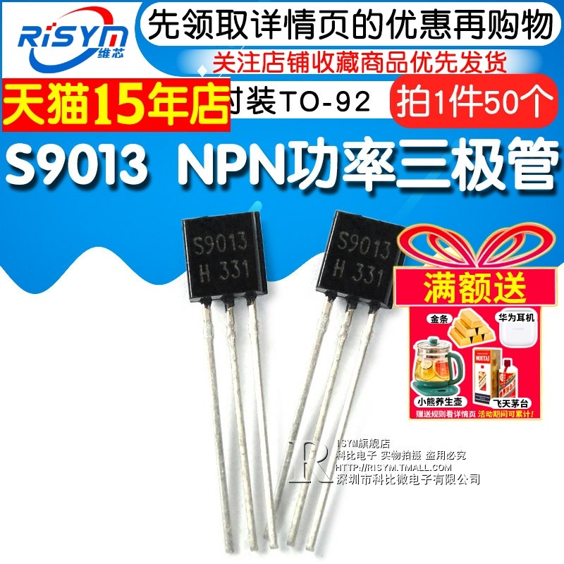 📚 Risym 三极管S9013 9013 NPN功率三极管 0.5A/40V 封装TO92 50只