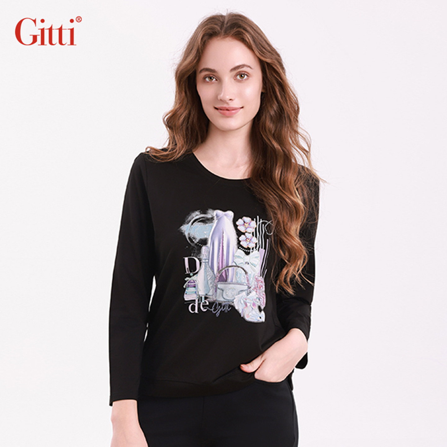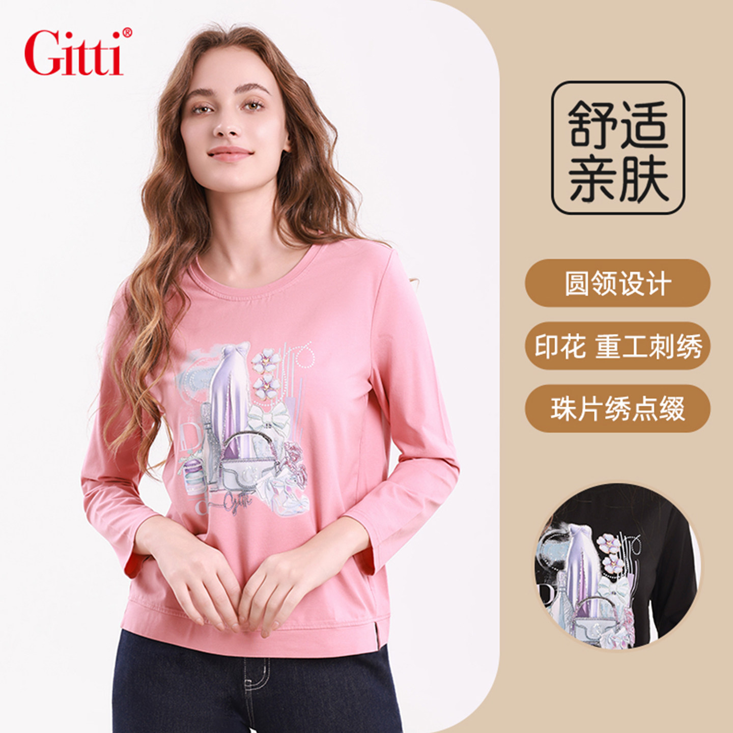 📚 Gitti/吉蒂重工刺绣珠片印花长袖T恤女棉莫代尔针织上衣G255526