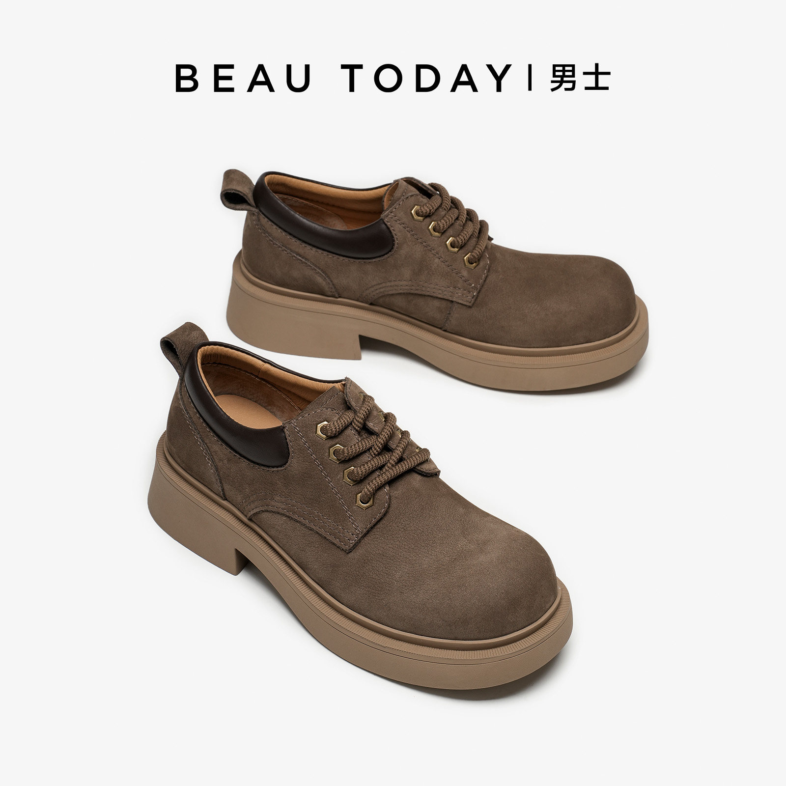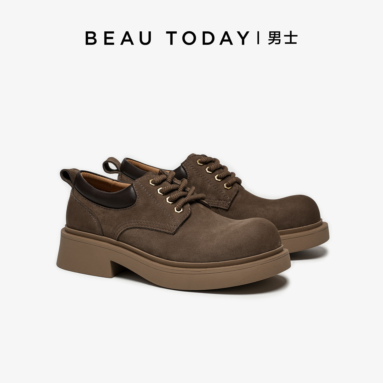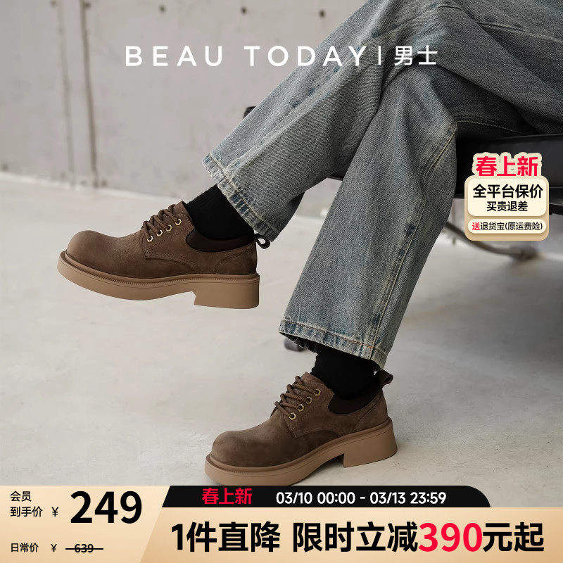 📚 BeauToday厚底休闲皮鞋男高级感大头德比鞋系带皮鞋翘头增高真皮