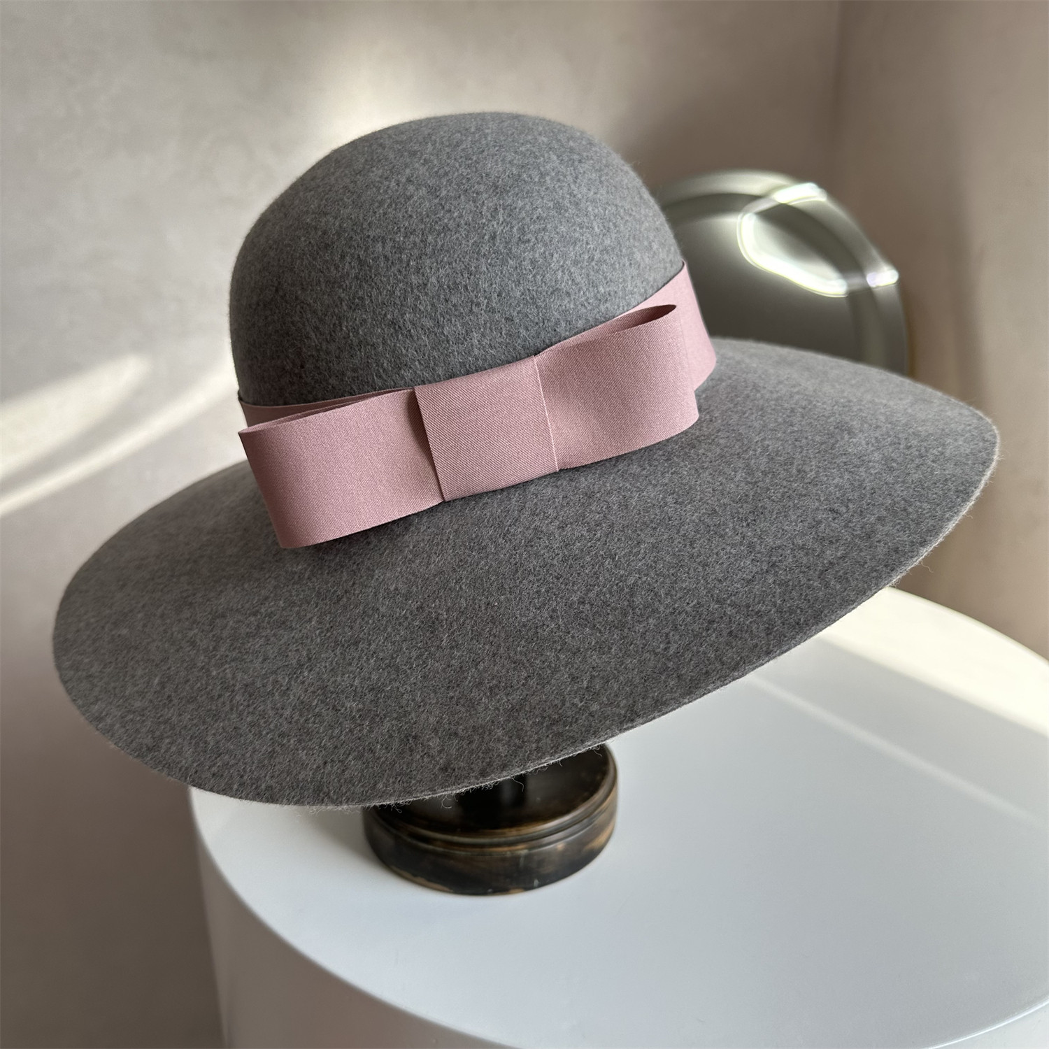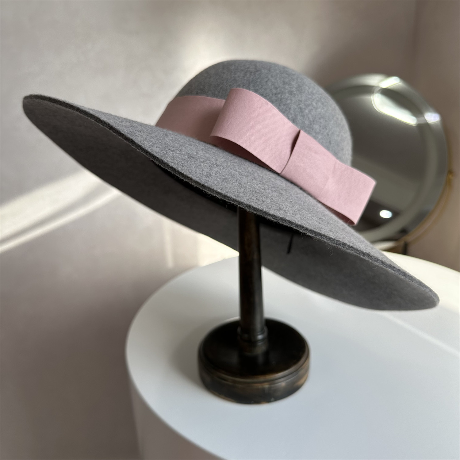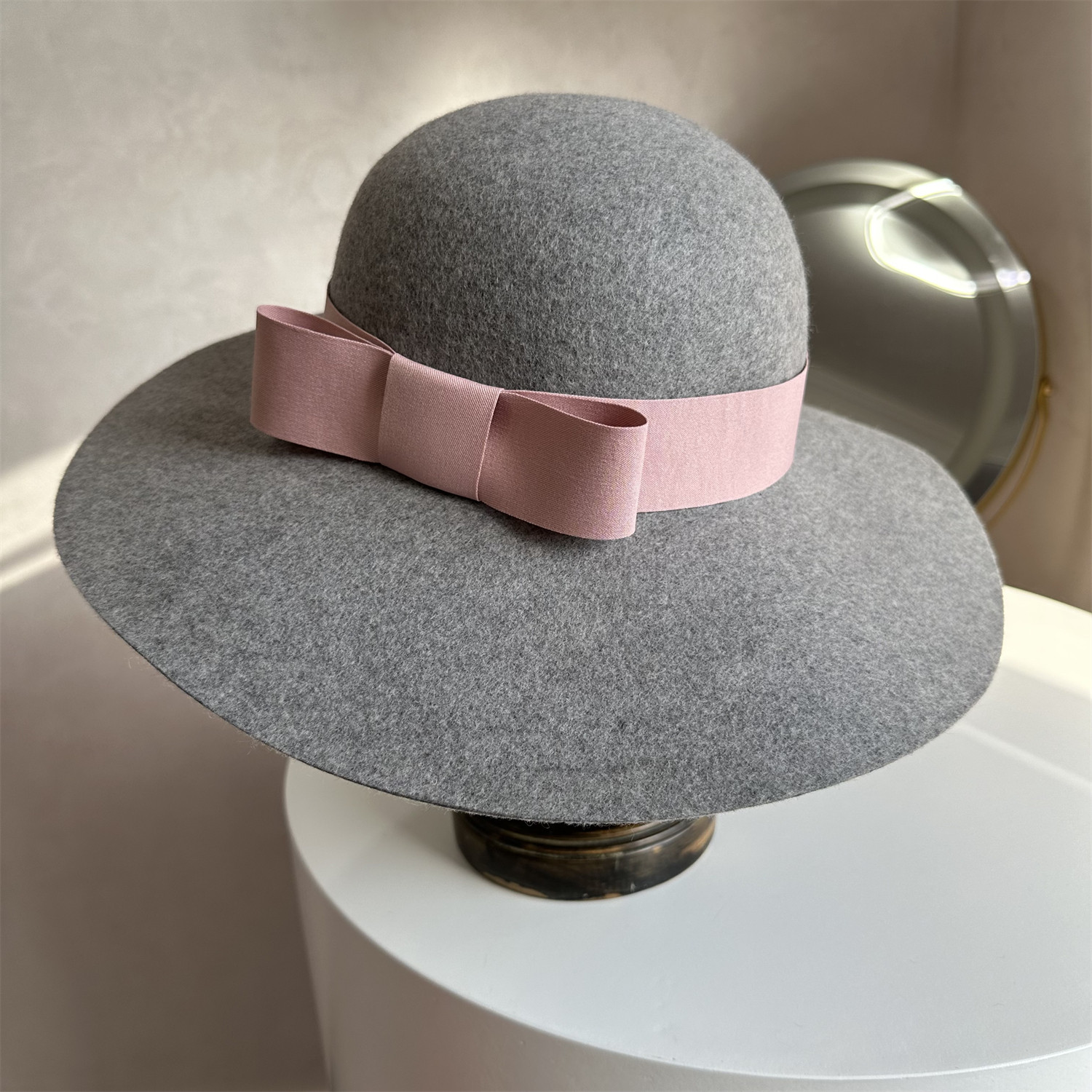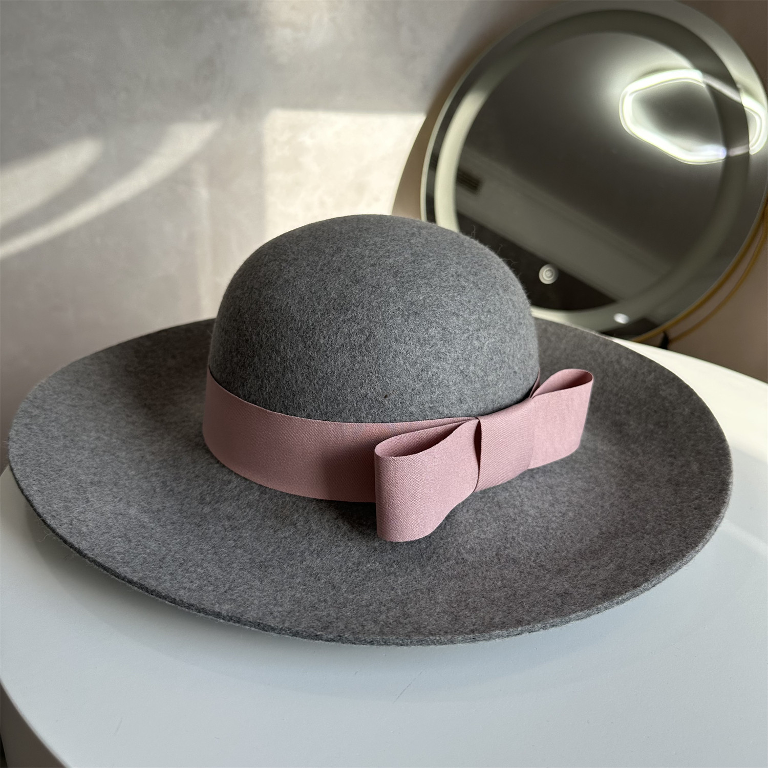 📚 秋冬气质灰粉色羊毛呢大檐礼帽女时尚百搭圆顶帽女英伦复古大沿帽