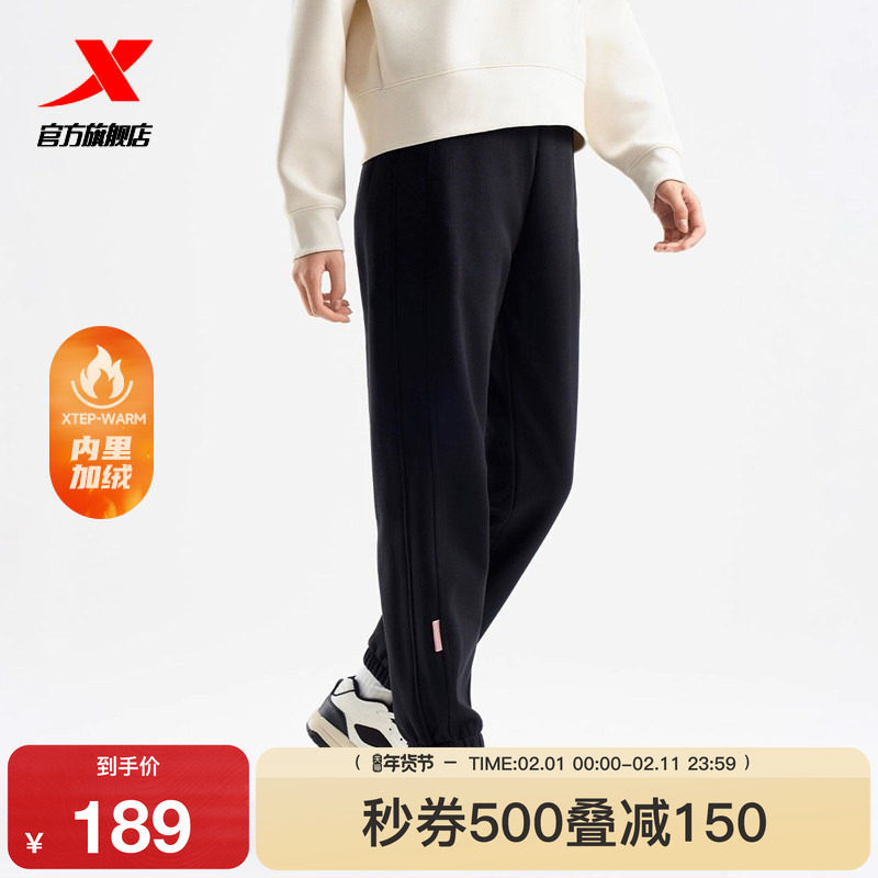 📚 特步加绒卫裤女款冬季束脚裤黑色运动裤针织长裤保暖休闲裤