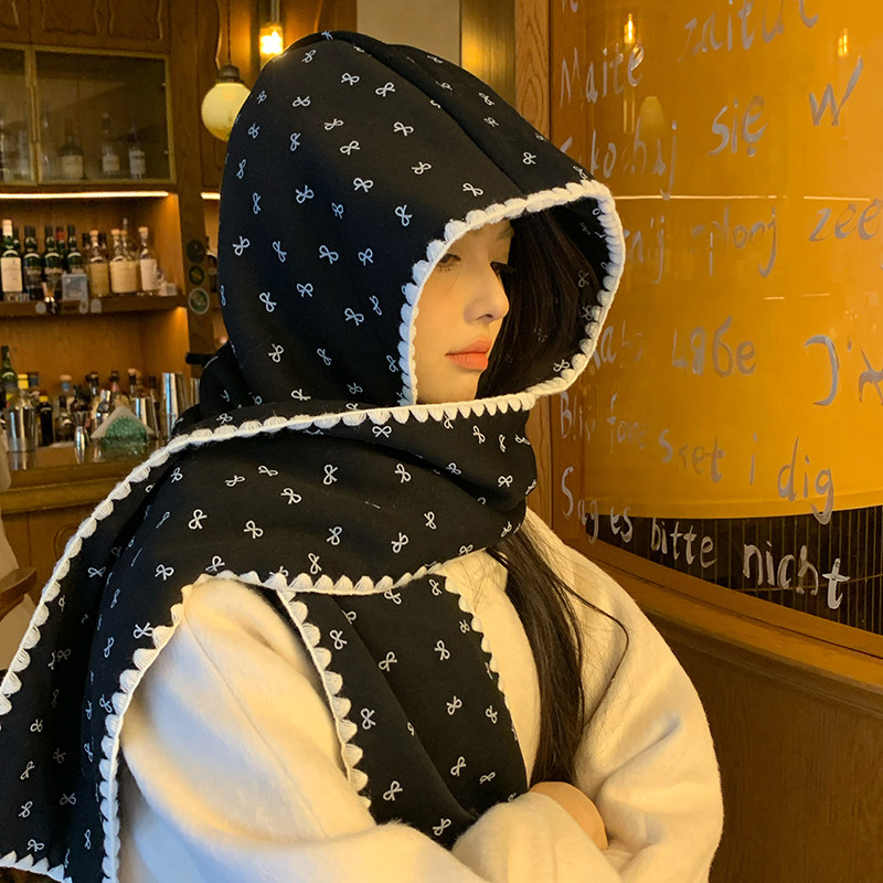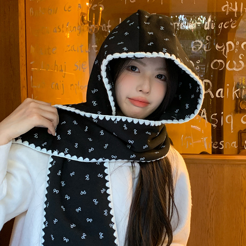 📚 蝴蝶结印花围巾帽子一体女2025秋冬季韩版保暖围脖百搭连帽围巾潮
