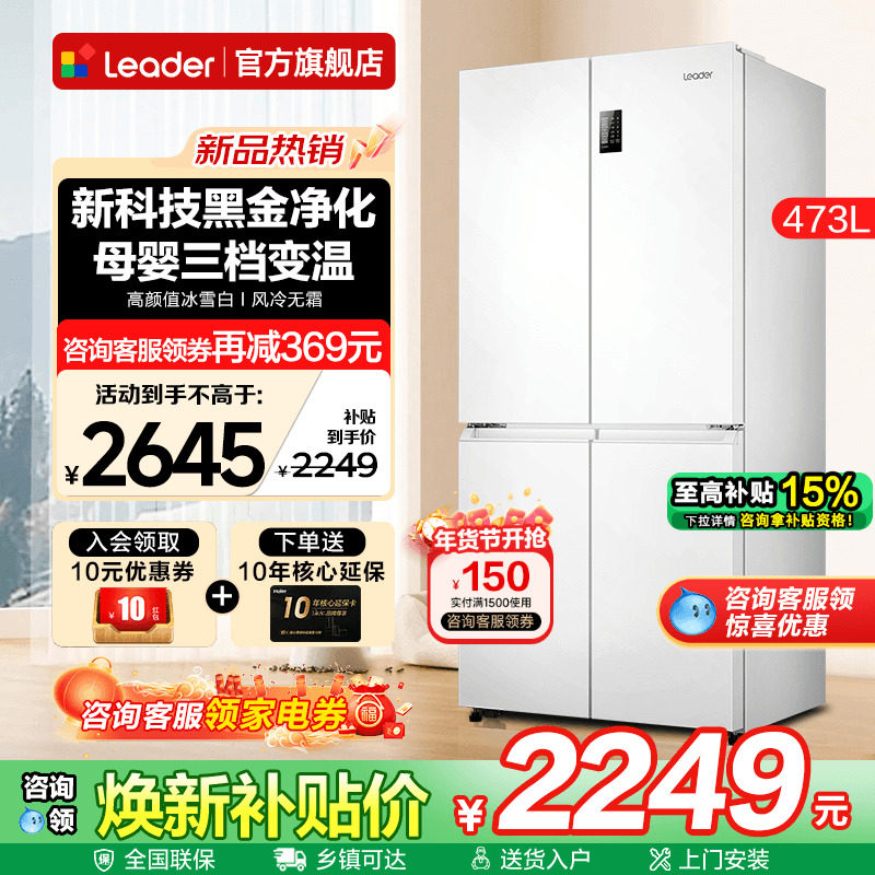 📚 海尔出品电冰箱473升白色Leader十字四开门一级家用无霜旗舰店