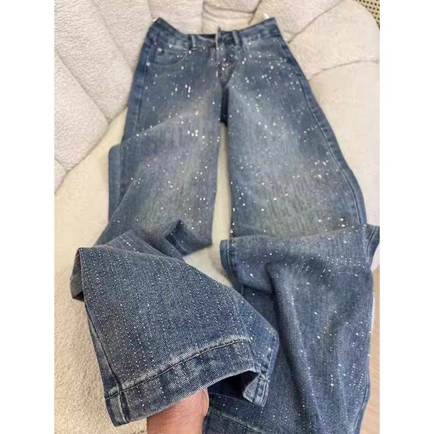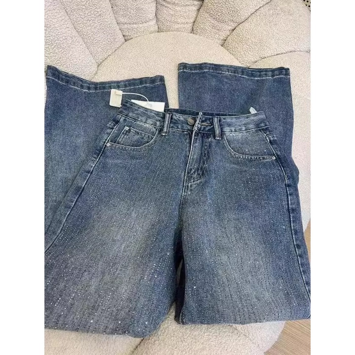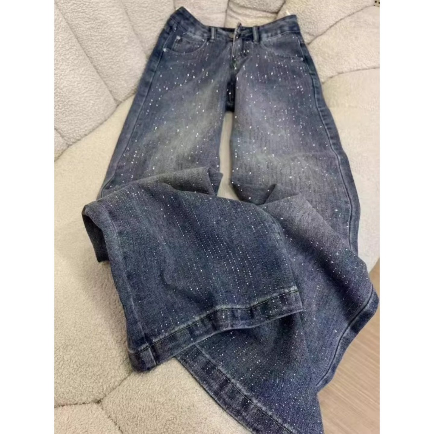 📚 加绒加厚美式闪钻满天星烫钻直筒牛仔裤女冬季高腰宽松阔腿拖地裤