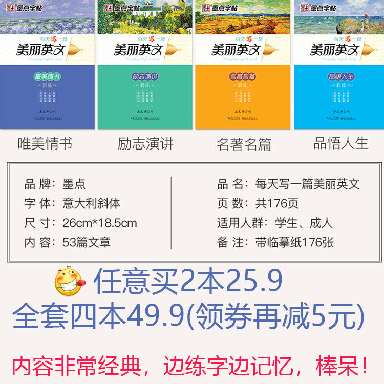27¥ HU926 qbE257U8Nn5¥ https://m.tb.cn/h.iqBNHfd 英文连笔字帖 龙文井成人高中生大学生考研意大利斜体英语练字贴 --------------------- 【原售价】30元 【现售价】25.9元。